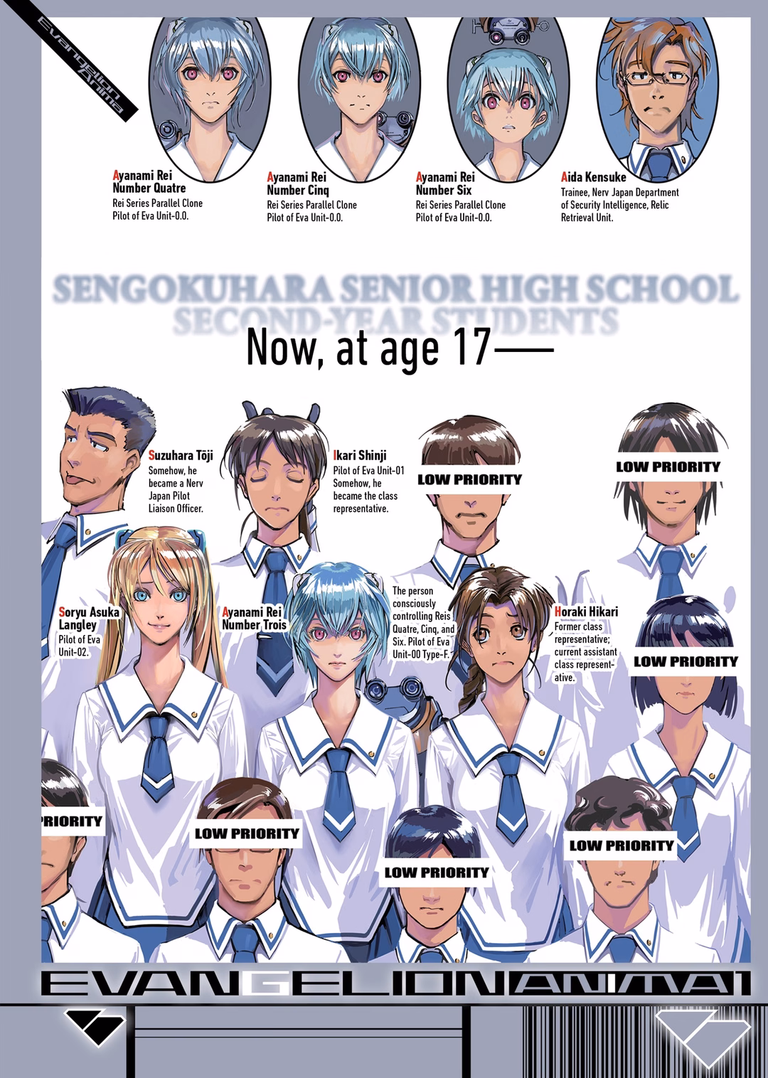 The current Rei was given a number—Number Trois—and became the primary Rei, with the three soulless clones—Number Quatre, Number Cinq, and Number Six—as her secondaries, whom she could control as extensions of her limbs, senses, and thoughts.