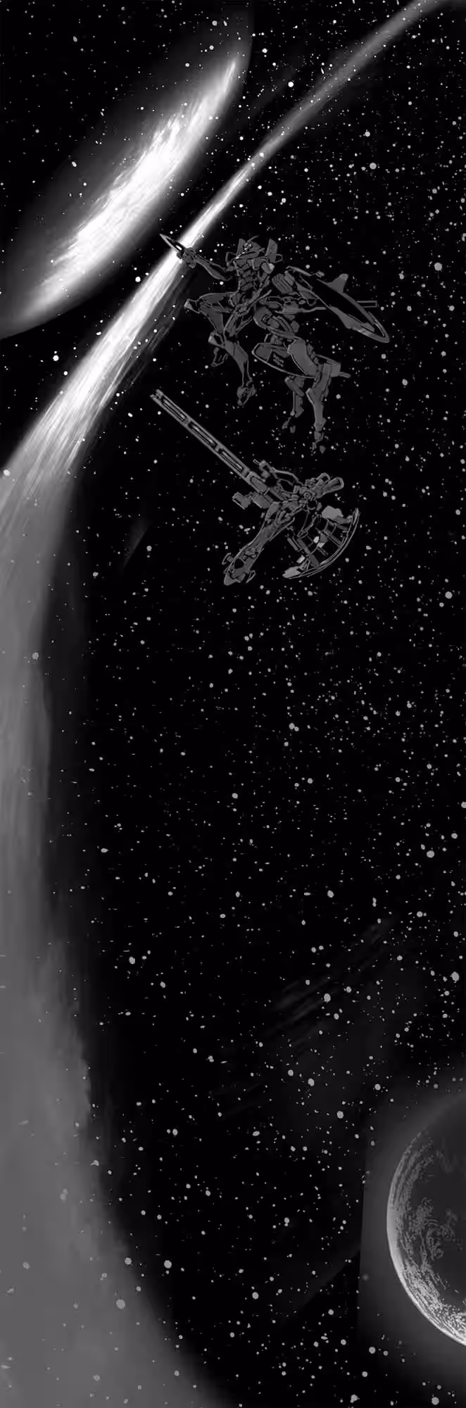 The three Eva-0.0 units floated above the Earth with their heads pointing down and their parasols facing the sun. As they flew, they scanned the outer reaches of the atmosphere with powerful sensors in their heads and receptor arrays in their shoulders. They transmitted the data they collected back to Nerv Japan HQ, all while carrying the half-asleep Reis inside.