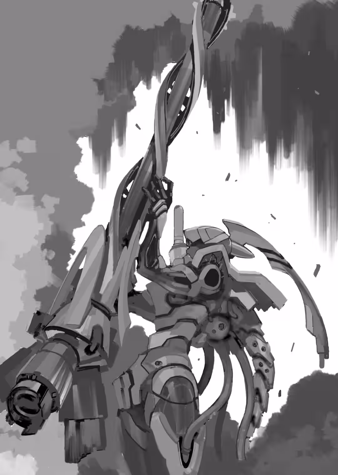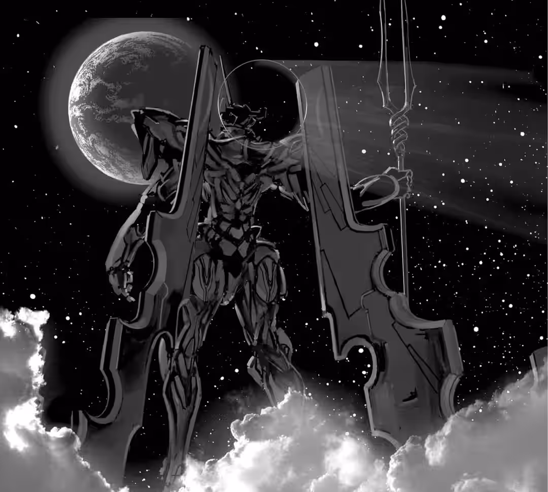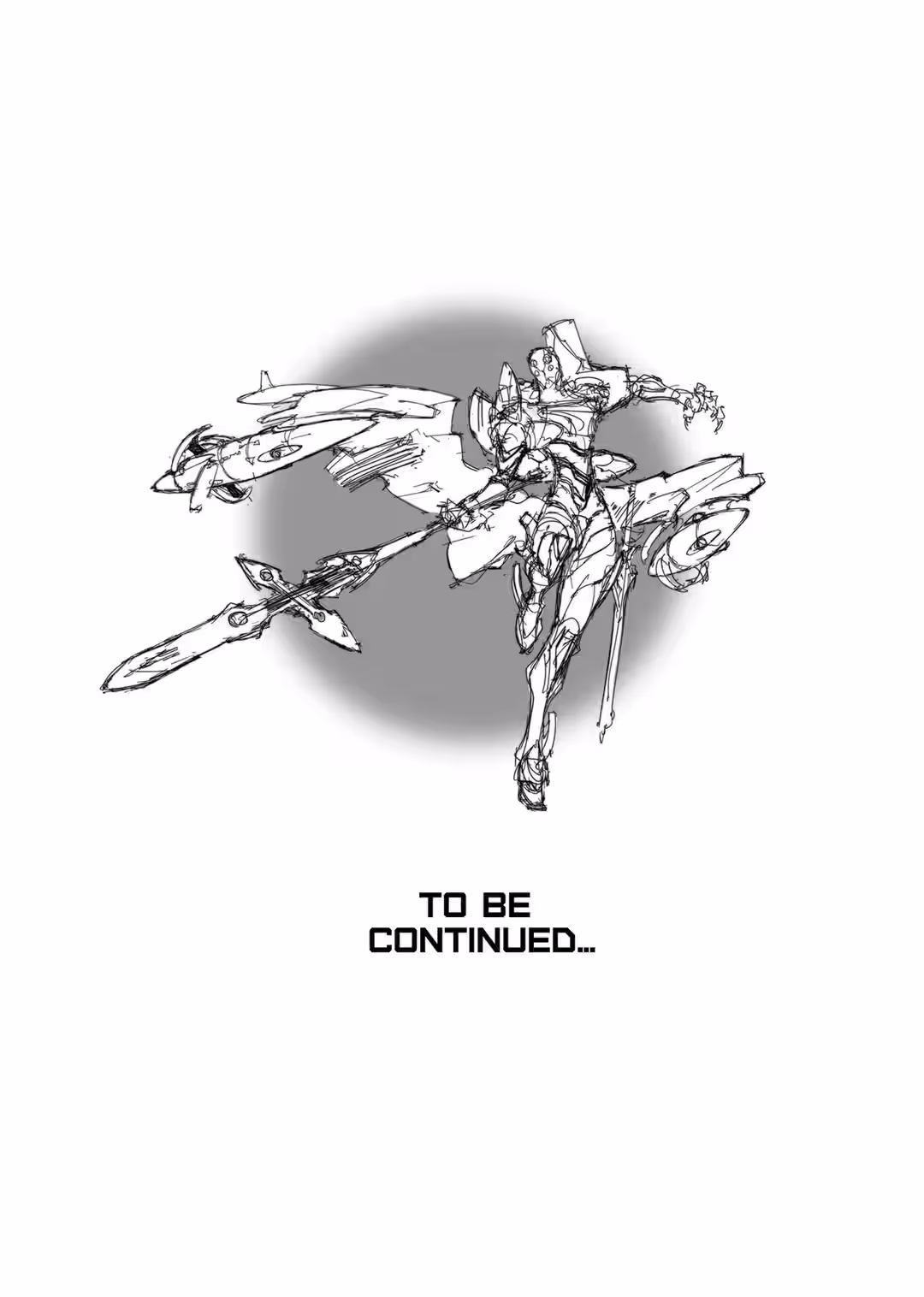 The Carrier was on top of him. It pulled back the staff and spun the weapon in a loop over its head. The axe-like tip rushed down toward Super Eva’s heart.