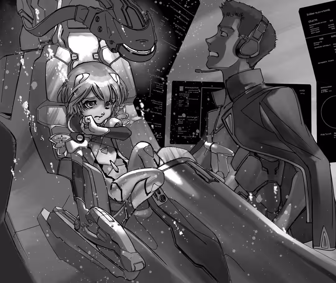 A clone of Ayanami Rei rode inside each Eva-0.0. They’d been cultivated in artificial wombs and assigned numbers: Quatre, Cinq, and Six. Now they slept, eyes half-closed, in their individual entry plugs. They slumbered in tranquility, almost as if time had stopped around them.
