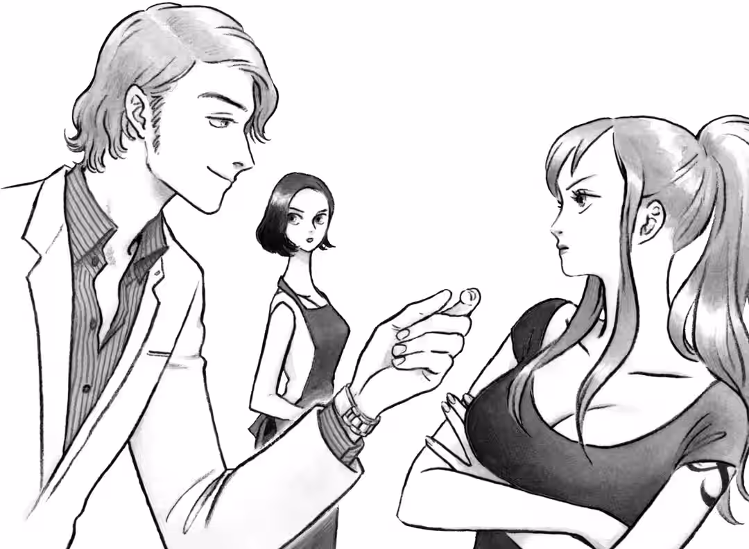 With remarkable, admirable dexterity, Nami cracked the lock on the safe and quickly stuffed the stacks of cash into a sack. As she was leaving the room, she turned to me and said, “Thanks for keeping quiet,” with a smile.