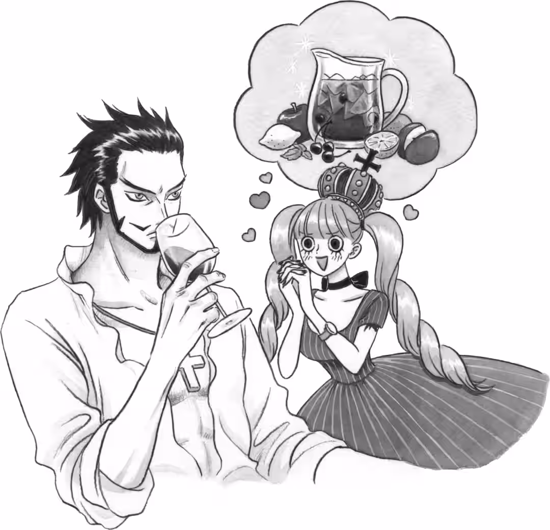 “How do you think I feel?” Mihawk said bitterly, glaring at her. He picked up the other shot, which was just wine, no fruit. He also poured sparkling water into Zolo’s glass, instructing him to join in their toast.