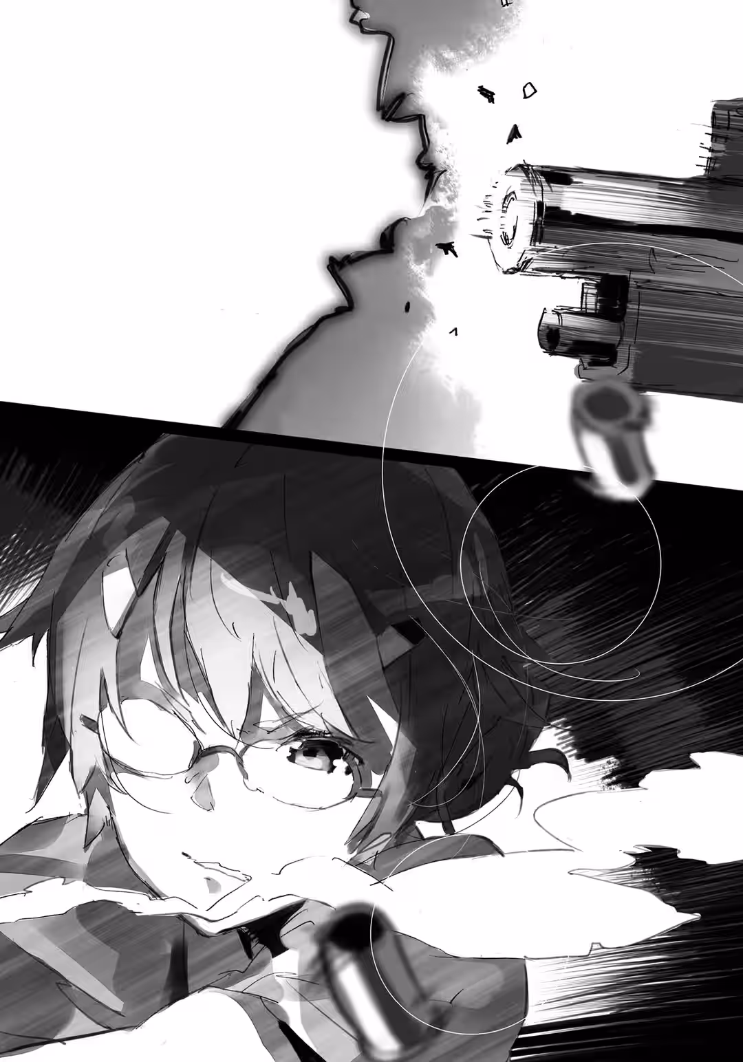 “She’s telling the truth—I see five people waiting outside,” Koganuma Minori-san reported, looking out the window. She was a few years older than me, and wore a uniform and glasses; she was my bodyguard and our resident WAC. She was a real peach with a sweet look and easygoing attitude. The kind of person you took one look at and said, “Oh, okay, a warm-and-fuzzy older-sister type.” But you might not guess that she was a capable sniper and a killer hand-to-hand fighter.
