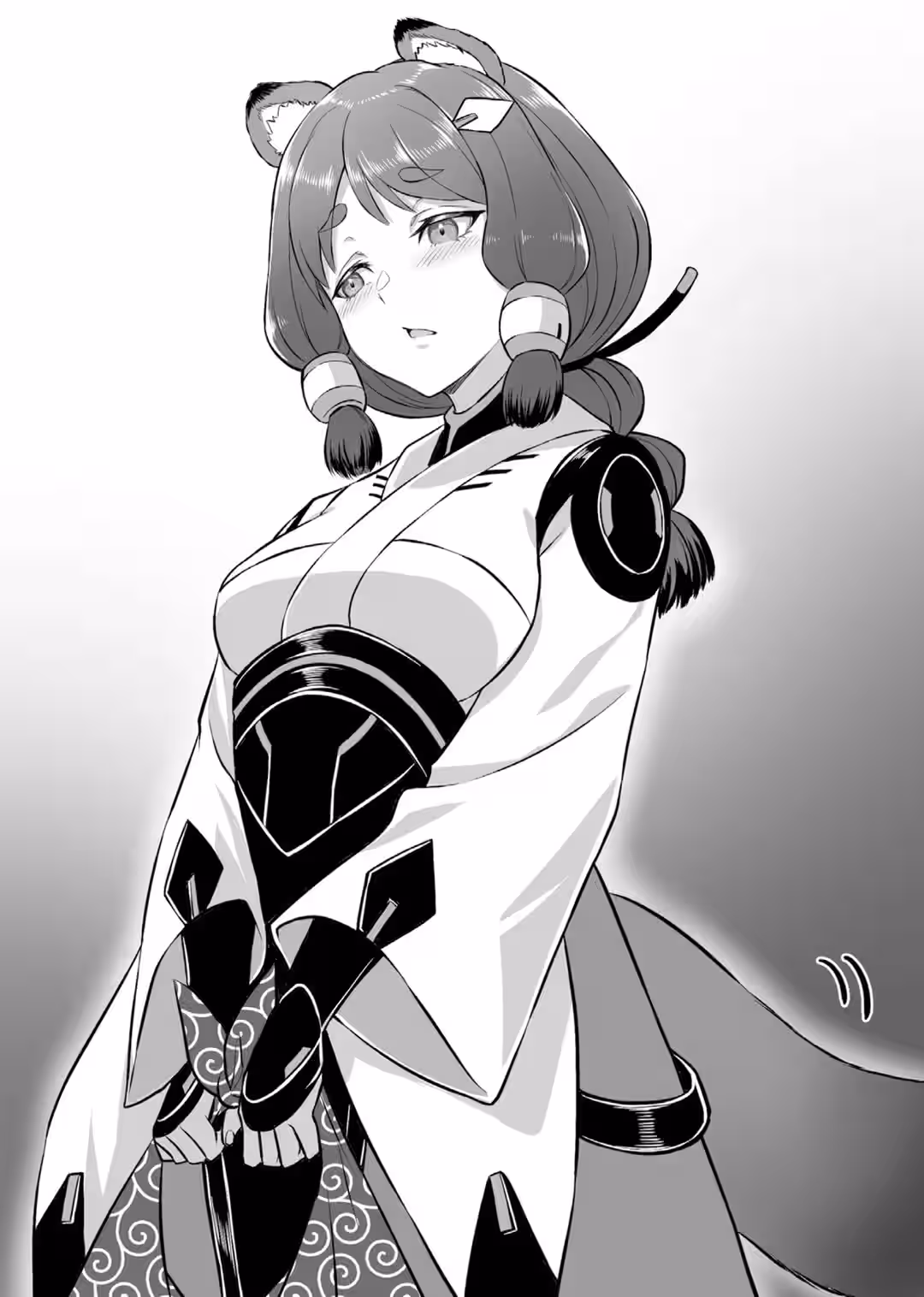 Her name was Konoha. Like Kugi, she hailed from the Holy Verthalz Empire; she was an official temple guardian. The tanuki samurai girl was the brute-force type, capable of using nothing but her katana to singlehandedly dispatch monsters that an entire platoon of power-armored soldiers would’ve struggled to deal with. I couldn’t help feeling that Konoha—like Kugi, a subservient silver-haired fox miko gal—had too much going on. Am I the only one who feels that way?