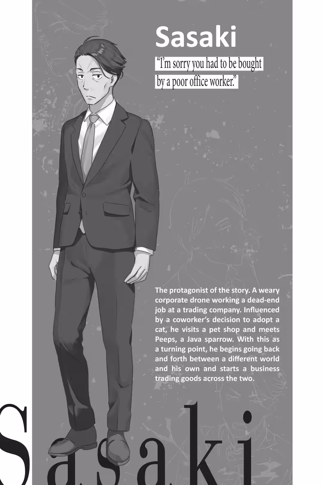 “…You don’t want these pellets here?” I asked, pointing to the bag beside the cage. It contained the comprehensive nutritional diet pellets I’d bought when I’d gotten him. The clerk had said they were packed with all the nutrients sparrows needed and that as long as the bird ate these, the only other thing it would require was water. It was a lifetime diet for a sparrow—kind of like a chain restaurant beef bowl for poor office workers.