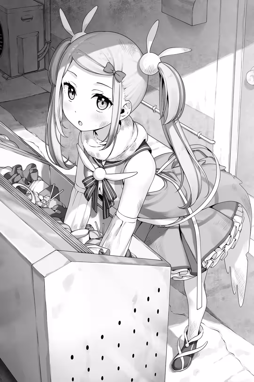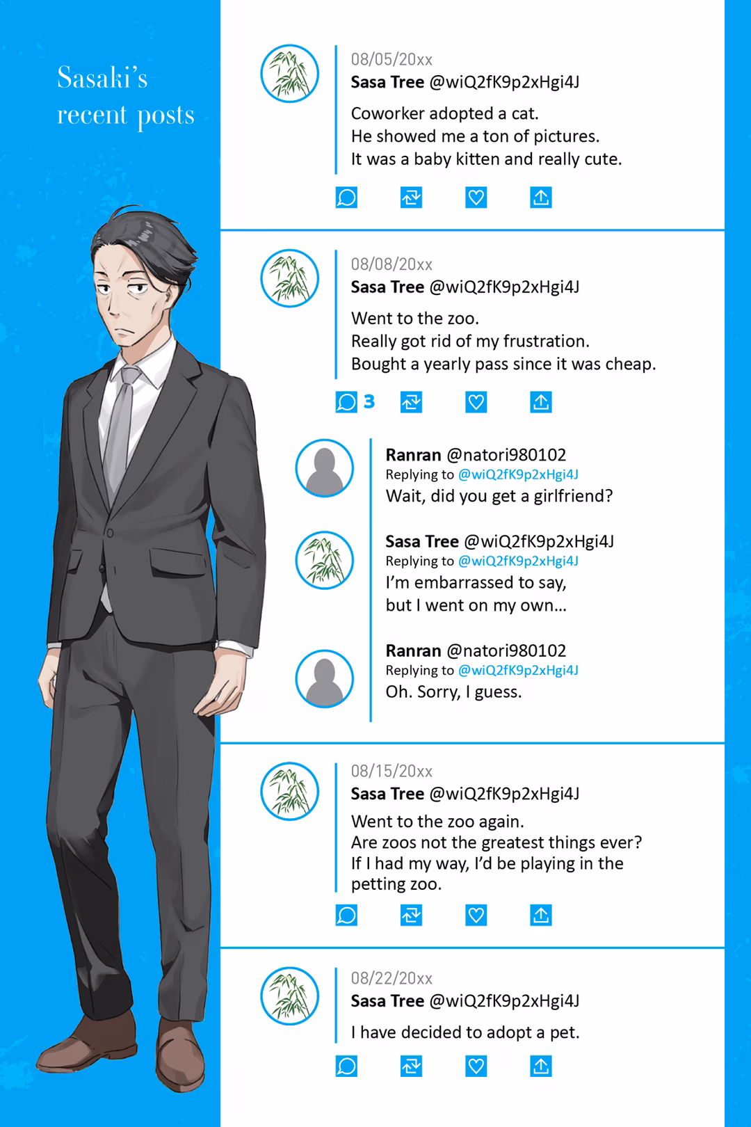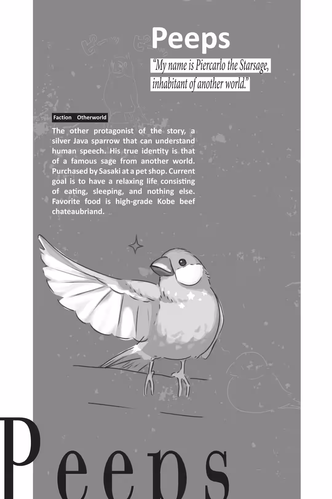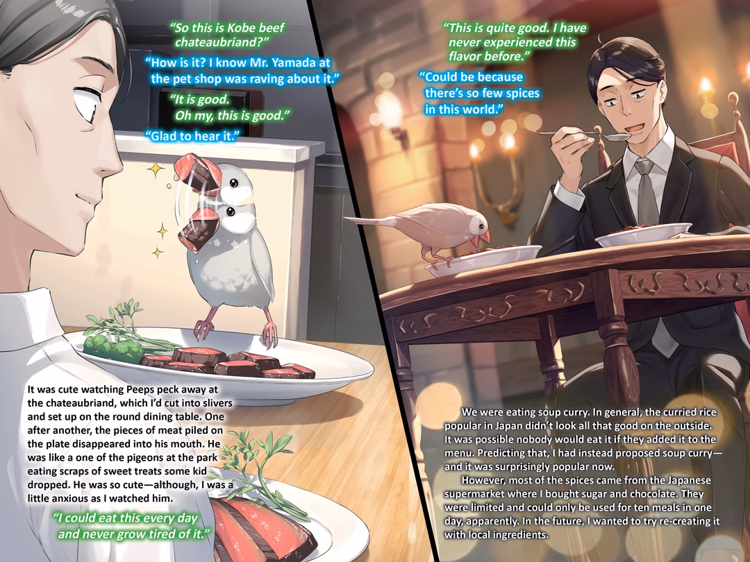 “…You don’t want these pellets here?” I asked, pointing to the bag beside the cage. It contained the comprehensive nutritional diet pellets I’d bought when I’d gotten him. The clerk had said they were packed with all the nutrients sparrows needed and that as long as the bird ate these, the only other thing it would require was water. It was a lifetime diet for a sparrow—kind of like a chain restaurant beef bowl for poor office workers.