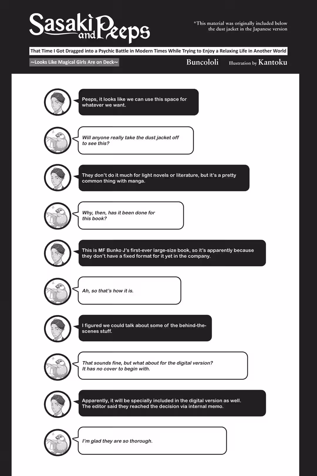 On that note, to move on to acknowledgments, I would like to thank the editorial department at MF Bunko J to begin with—and also the marketing team, proofreaders, and designers. I know I’ve put more of a burden on you than for your usual bunkobon-format books. I deeply thank you all for your assistance with this work despite how busy you all are.