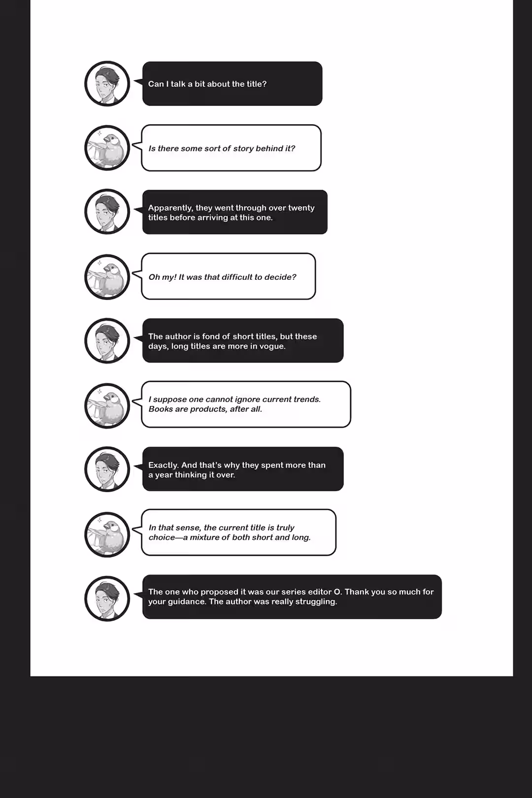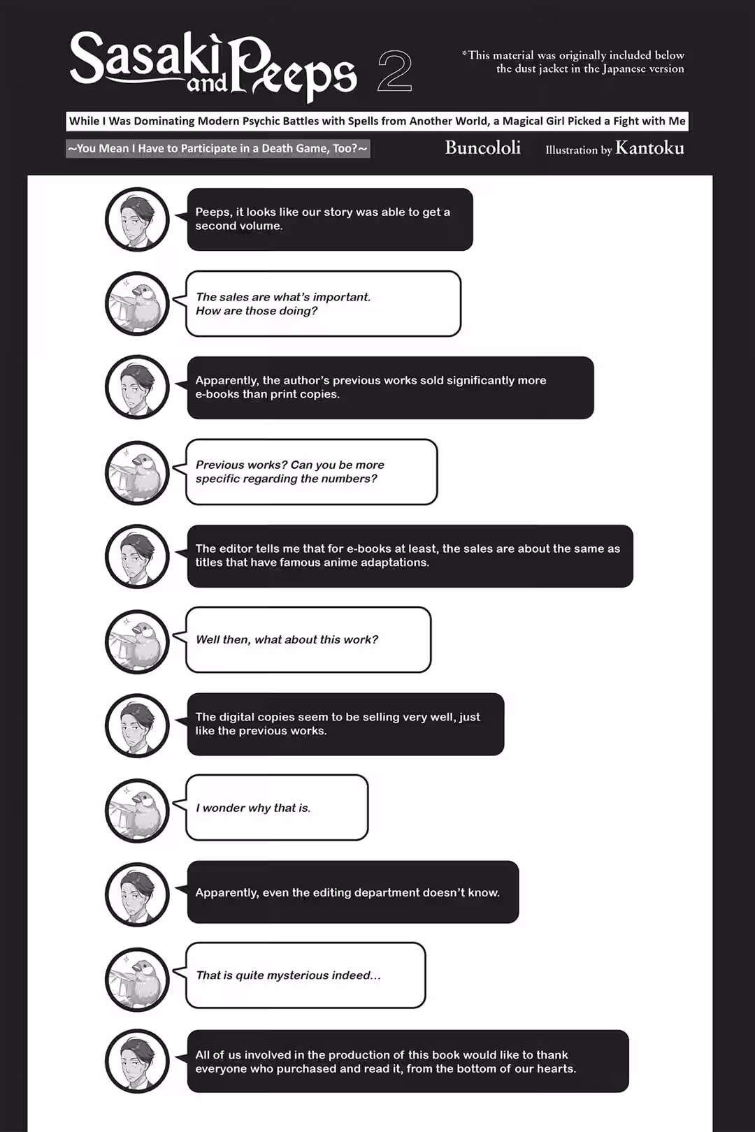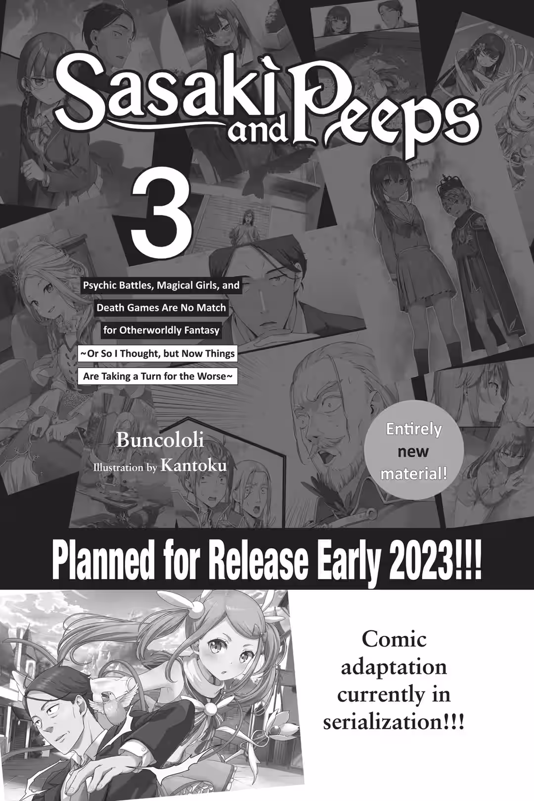 I’d like to thank everyone who purchased Sasaki and Peeps. I’d also like to apologize to those who have been waiting for so long for the web novel’s continuation.