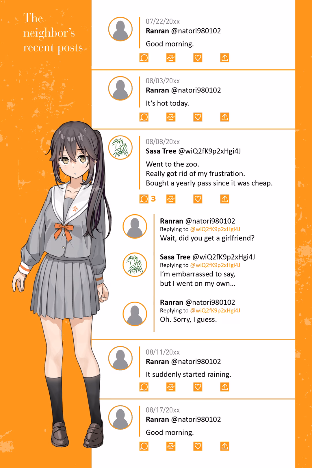 No one wants to talk to someone as boring as I am. In fact, in elementary school, I got bullied over everything I did. And besides, after school, I always spend my time waiting in front of my apartment for the man next door.
