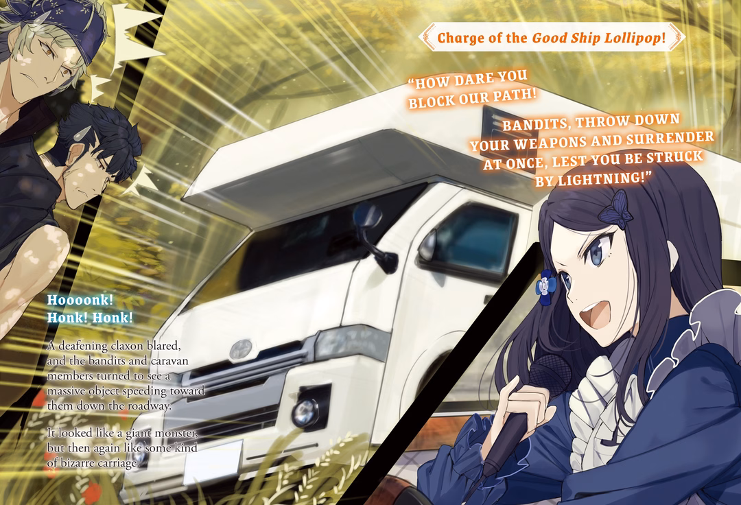 RVs are fast, provide shelter from the rain, have plenty of loading capacity, are comfortable to live in… They would provide protection from arrows as well, and even an assailant with a sword would have a hard time killing the driver right off the bat, which meant Mitsuha could jump to safety if need be. Safe, fast, comfy─it was the perfect mode of transport.
