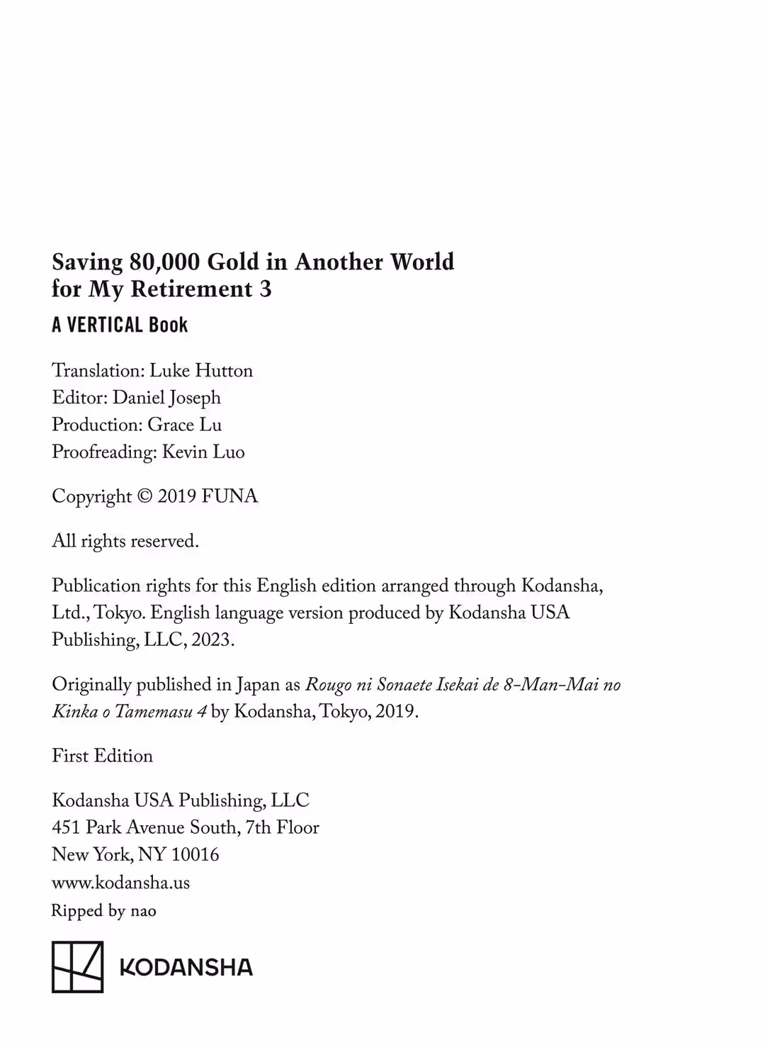 Hello again, FUNA here. Thank you very much for reading volume three of Saving 80,000 Gold in Another World for My Retirement!