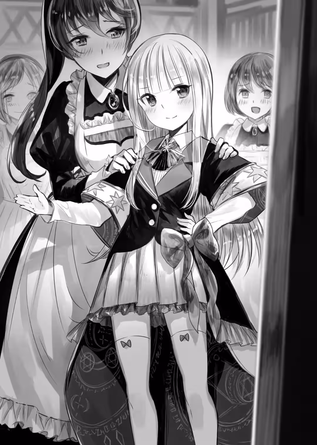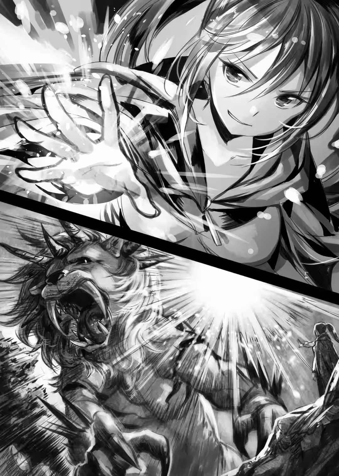As they proceeded, monsters began to show themselves. But instead of running to attack Luminaria and Rio, they seemed to be rushing away from something. Among them were monsters that would usually never show up in this environment. No matter—every one of them blazed to ash the moment Luminaria raised her hand, victim of her overwhelmingly fast magic casts. Rio watched her godlike sorcery, fascinated, and gradually forgot her fear of the monsters.