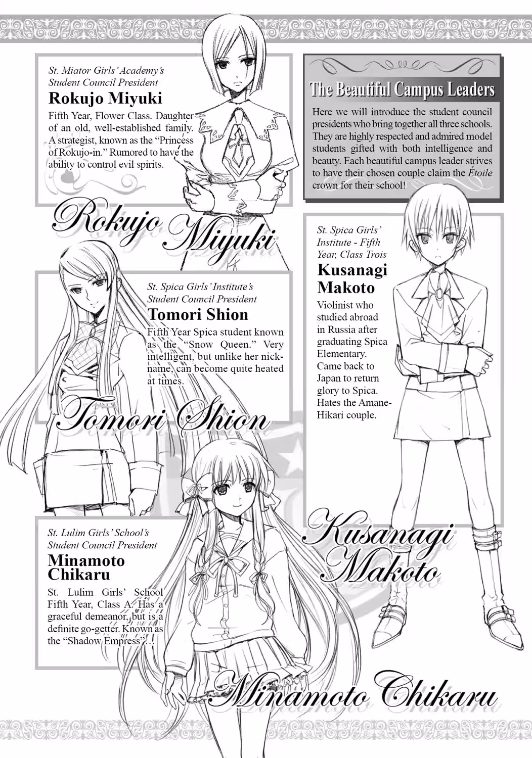 For some reason the Étoile competition had turned into an effort to avenge Amane’s defeat. Chikaru’s bold plan to create a couple from students of different schools—an unprecedented coupling in Astraea’s Étoile competition history—had riled up a festival-like excitement at Spica and Lulim. The alliance was creating a friendly atmosphere, for sure.