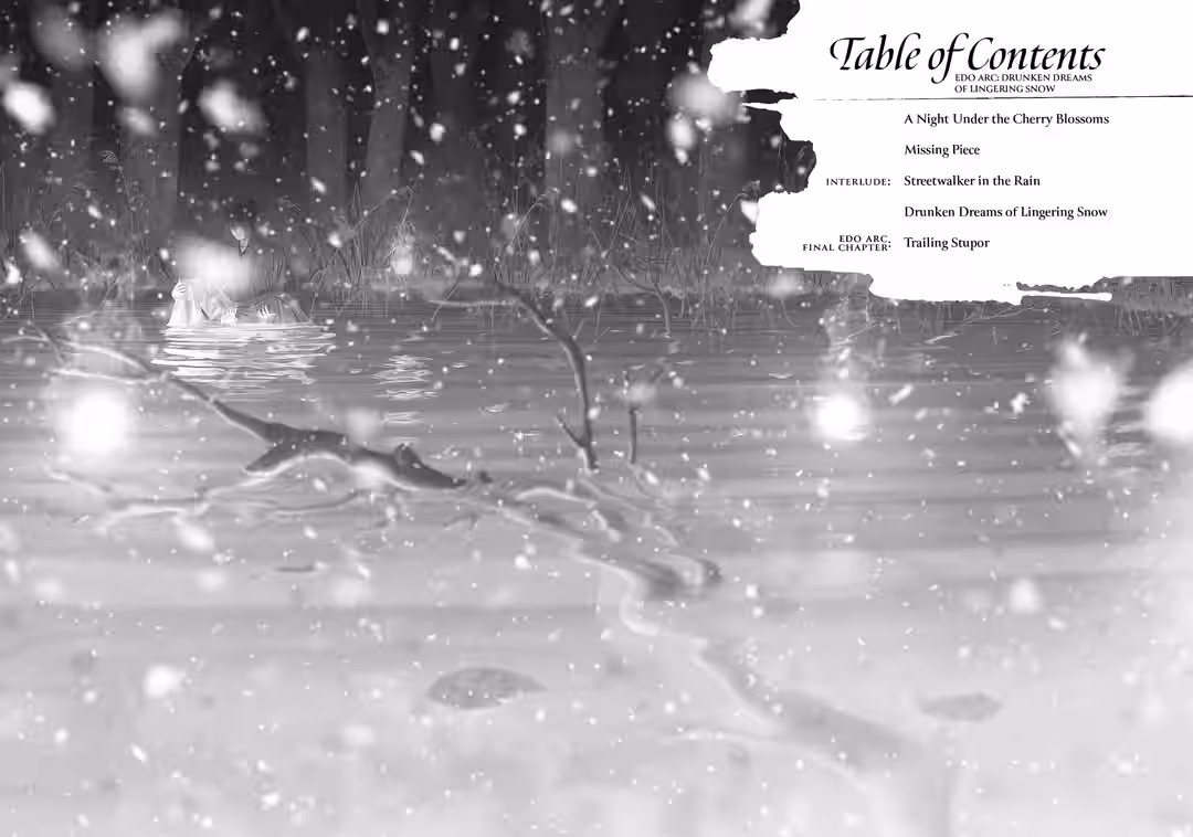 “…Rest well, Shirayuki.” His words faded into the distant night sky as pure-white snow danced down. He looked up to the heavens from the spring. The pale moon was nowhere to be seen, hiding itself behind gray clouds. Even so, he recalled the night sky he saw back then and bid his farewell.