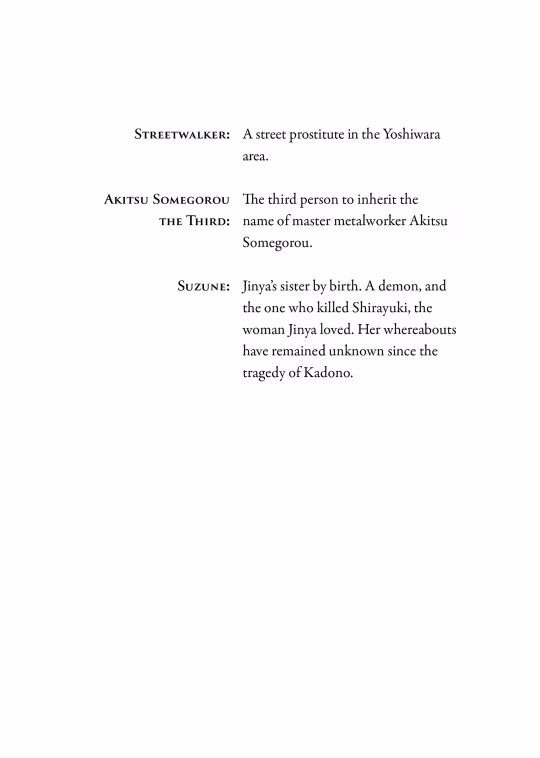 None, that is, save for one demon woman, a Yasha guardian, and a stranger even the Yasha guardian couldn’t quite figure out—the woman who would not reveal her name, simply asking to be called “Streetwalker.” Under the faint light of a hazy moon, her skin glowed even paler than it already was.