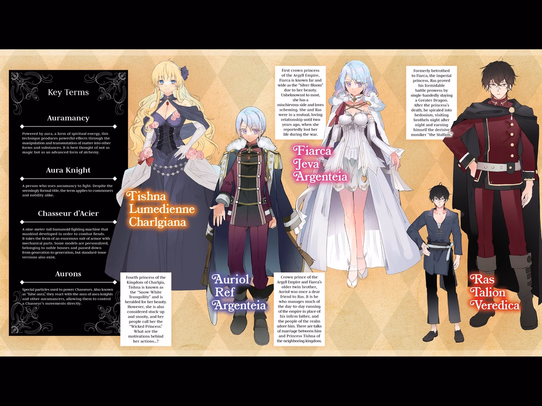 The mirror spanning one wall showed two women. The first was a noble lady with violet eyes and silver hair. Thought by all to be dead, she was the princess of the Argyll Empire, Fiarca Jeva Argenteia. Behind the seated Fiarca stood another silver-haired girl who looked exactly the same. This was Elmira Almathe, an agent raised from birth to act as the princess’s body double.