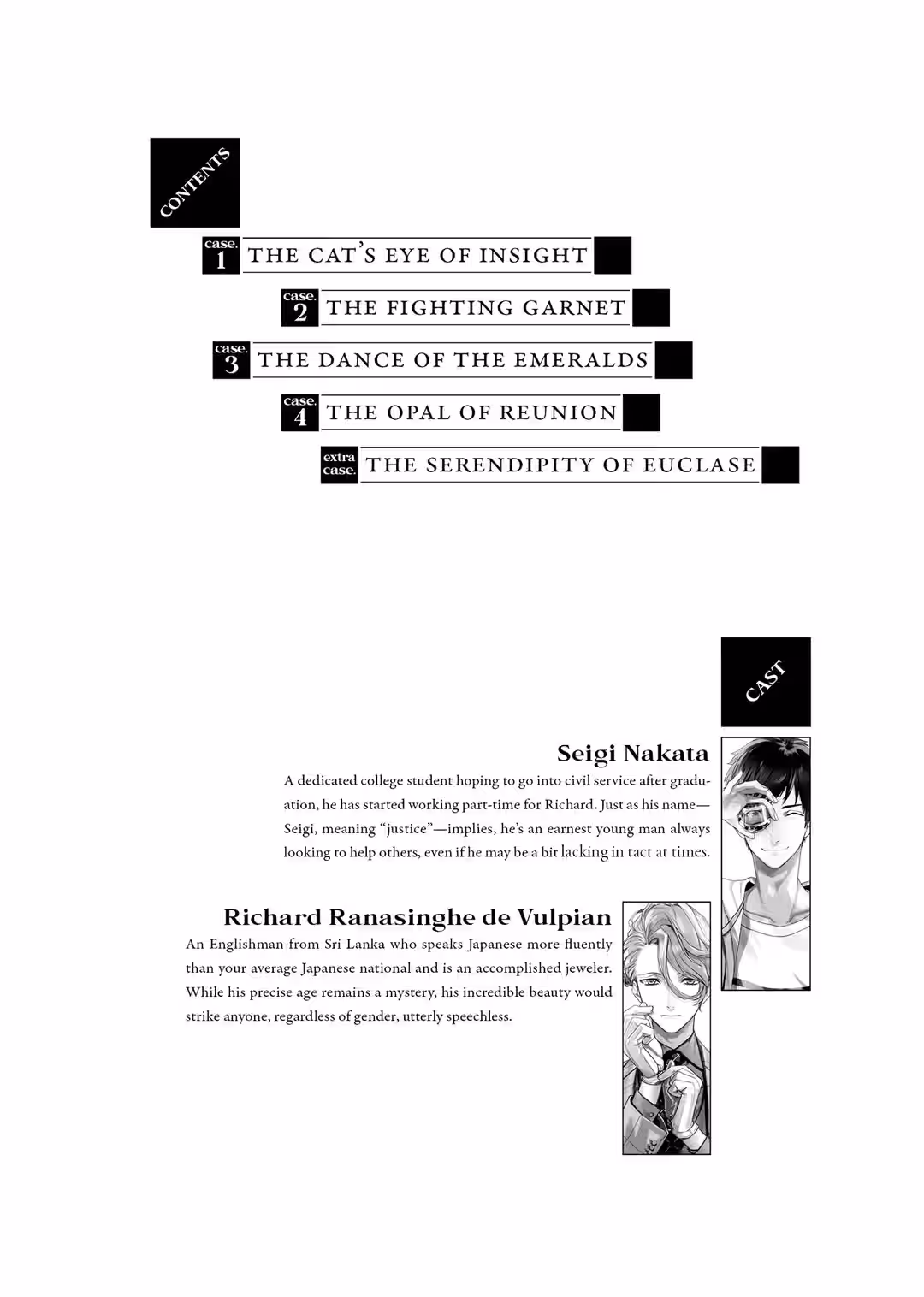 Rough euclase? I cocked my head to the side, confused, and Richard whipped out his phone and image-searched it in Roman letters. I shouldn’t have been surprised that the results he pulled up were written in English. A stream of images of icy white and blue rocks flowed down the screen. It reminded me of all those pictures of mineral specimens that Tanimoto had shown me. There were some emerald green and faintly yellow ones, too.
