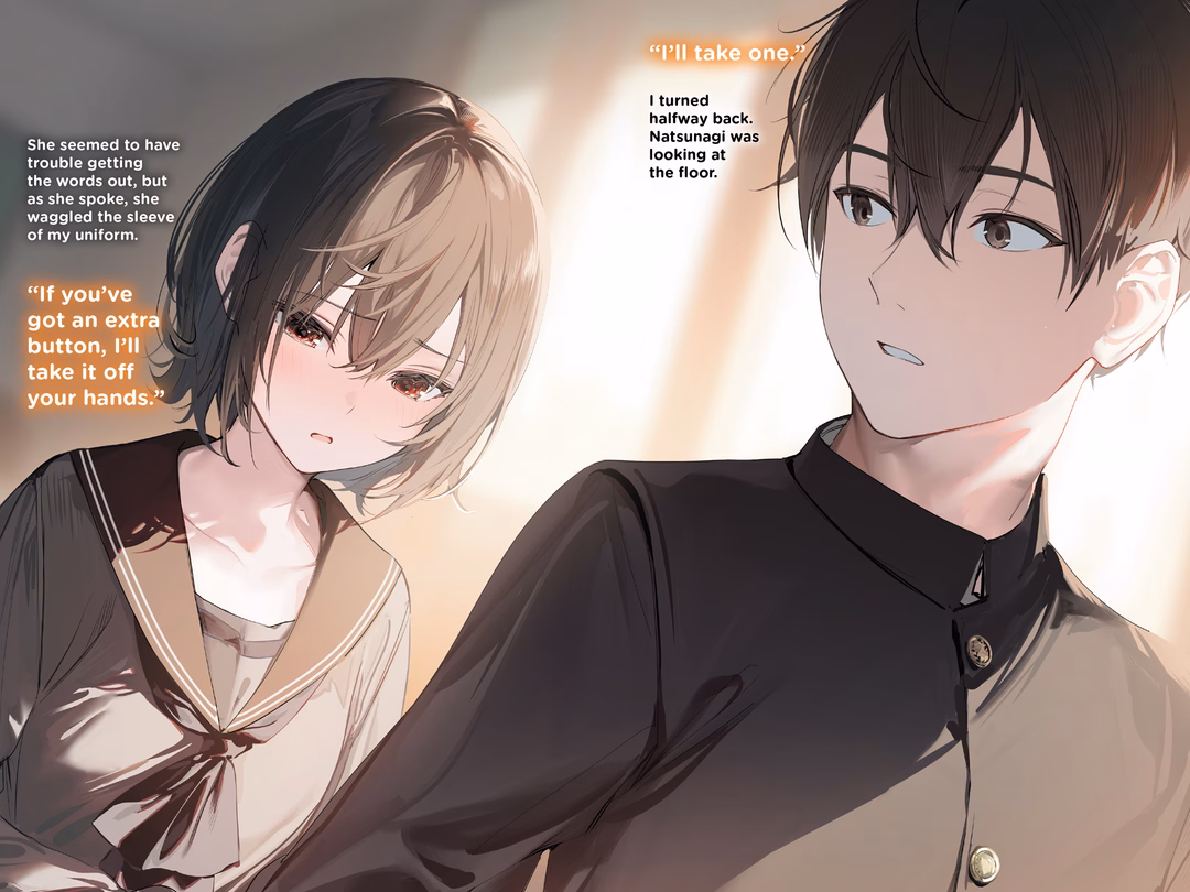 “It’s your high school. At least remember what it’s called.” Natsunagi gazed at me with a smile that seemed a bit strained. “You at least remember which university you got into, right?” she asked. I’d just received my letter of acceptance a few days earlier.
