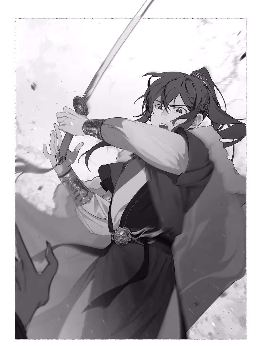 Xue Meng’s sudden startled cry brought Chu Wanning’s mind back to the present, and his gaze followed the call only to see that roaring molten metal was again rolling in the crucible. The ancient tree spirit broke through the waters once more, wreathed with flames. However, the tree spirit’s eyes were rolled back; it was obviously not in its right mind. In its hands, it held that shimmering silver sword, the sacred blade of Gouchen the Exalted.