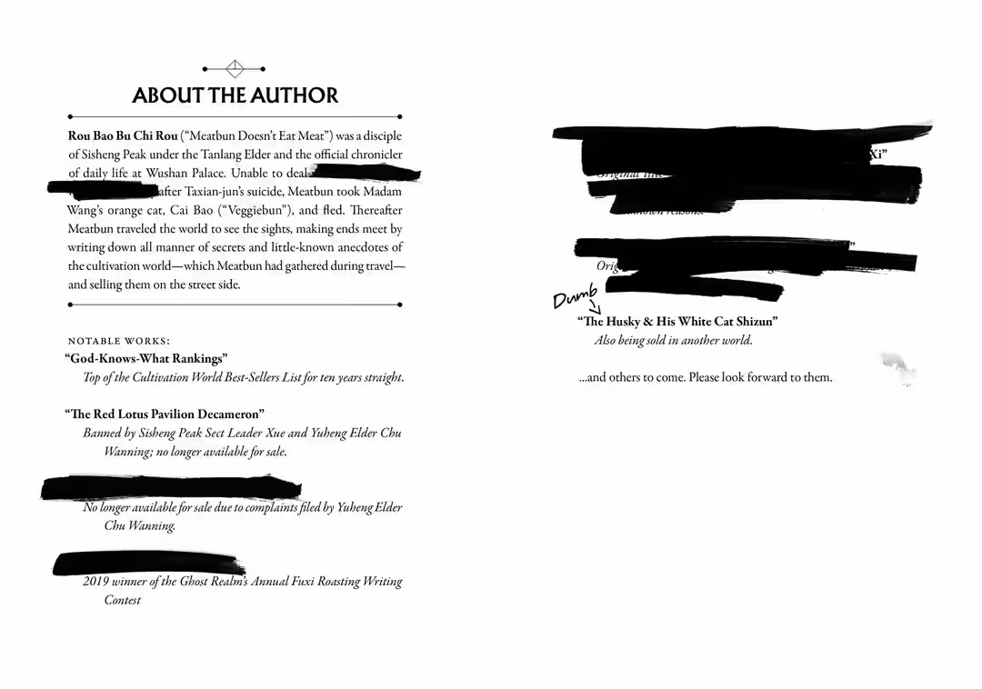 Rou Bao Bu Chi Rou (“Meatbun Doesn’t Eat Meat”) was a disciple of Sisheng Peak under the Tanlang Elder and the official chronicler of daily life at Wushan Palace. Unable to deal ███████████████████████████ after Taxian-jun’s suicide, Meatbun took Madam Wang’s orange cat, Cai Bao (“Veggiebun”), and fled. Thereafter Meatbun traveled the world to see the sights, making ends meet by writing down all manner of secrets and little-known anecdotes of the cultivation world—which Meatbun had gathered during travel— and selling them on the street side.