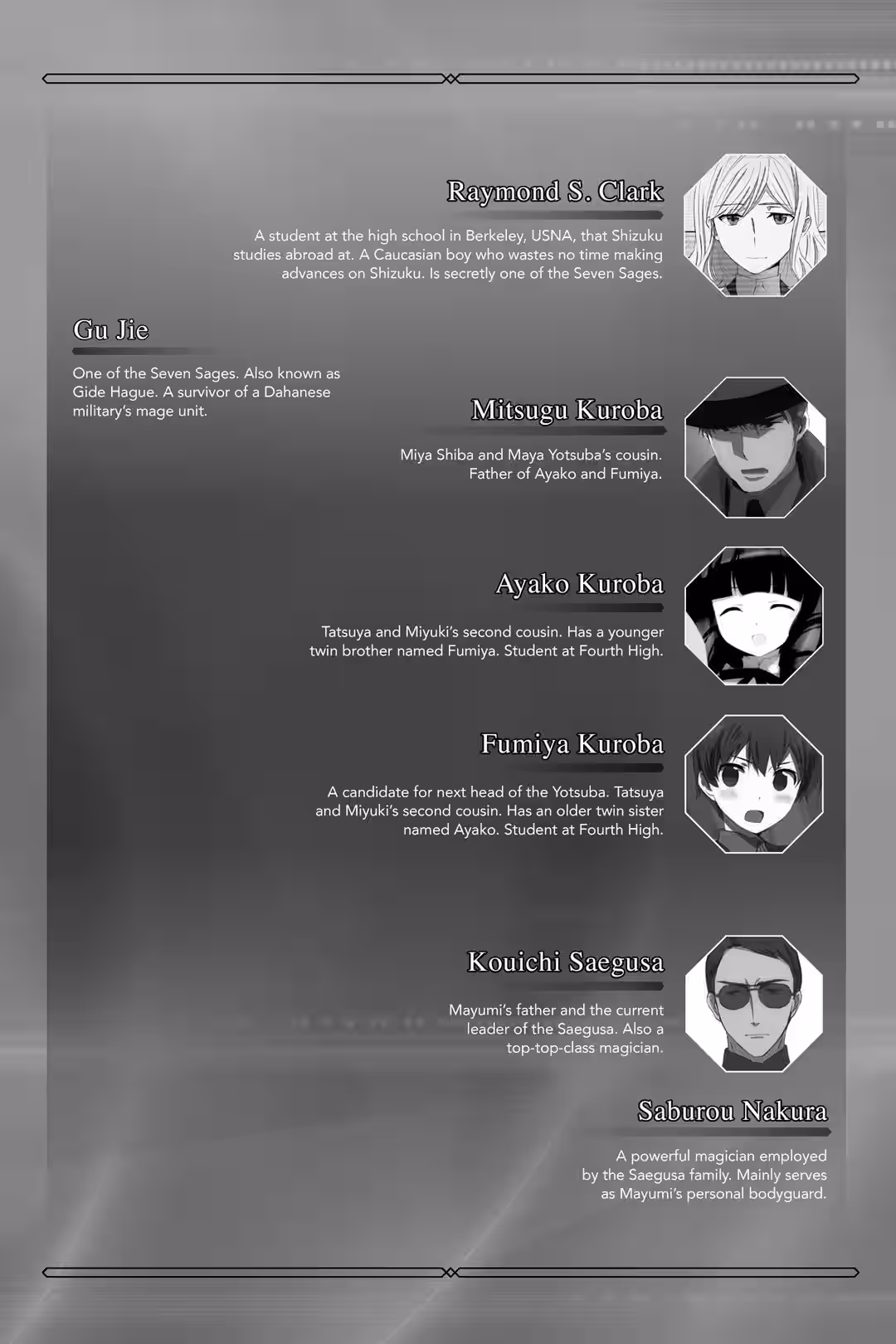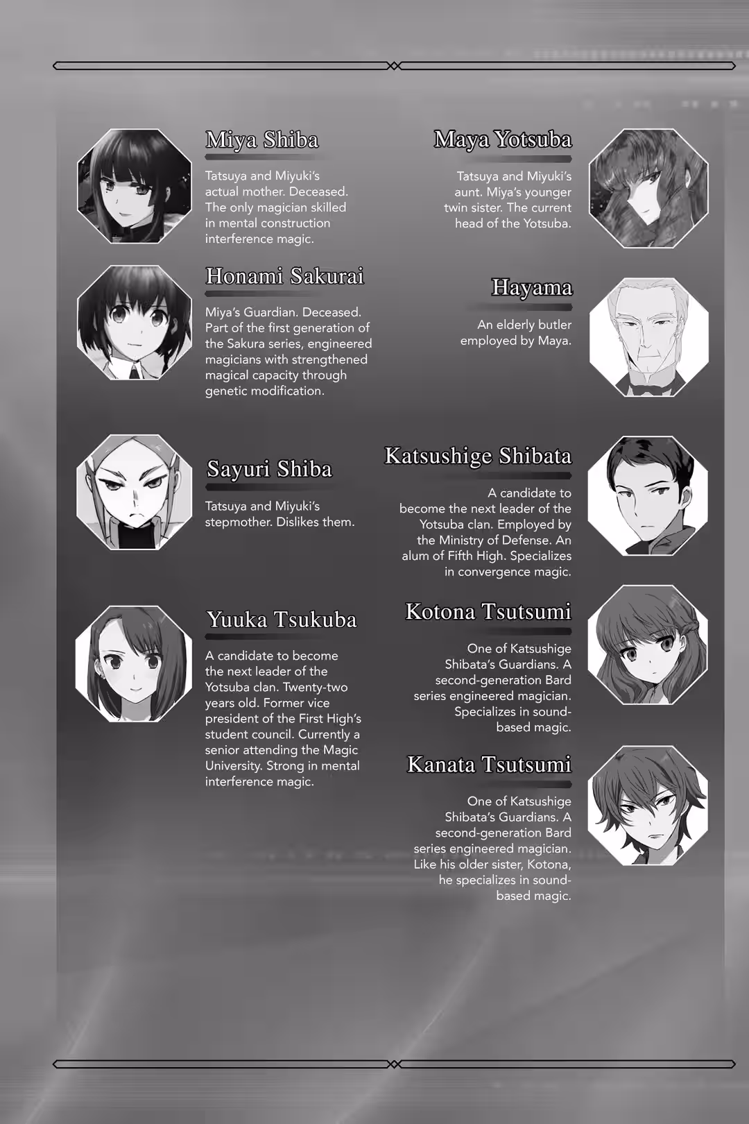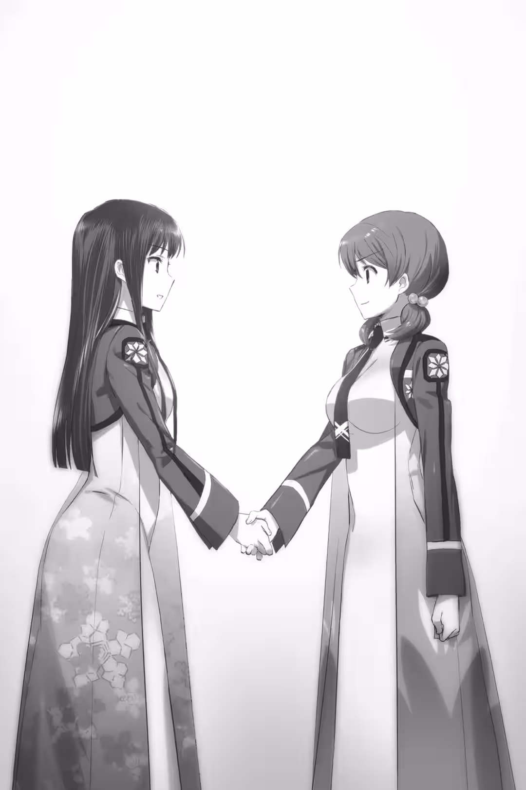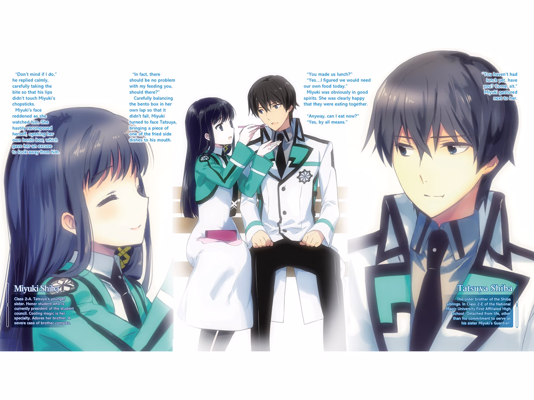 But for those who did know Tatsuya and Miyuki Shiba, their shock was over nothing so vague as to what this news might presage for the future but rather something much more concrete and current: Not only were Tatsuya and Miyuki direct descendants (in a sense) of the Yotsuba line, but because their specific relation to the Yotsuba family had been concealed, it was hardly surprising that the revelation came as a true bolt from the blue to all the boys and girls who had variously felt friendship, rivalry, or something greater than that for either of the two.
