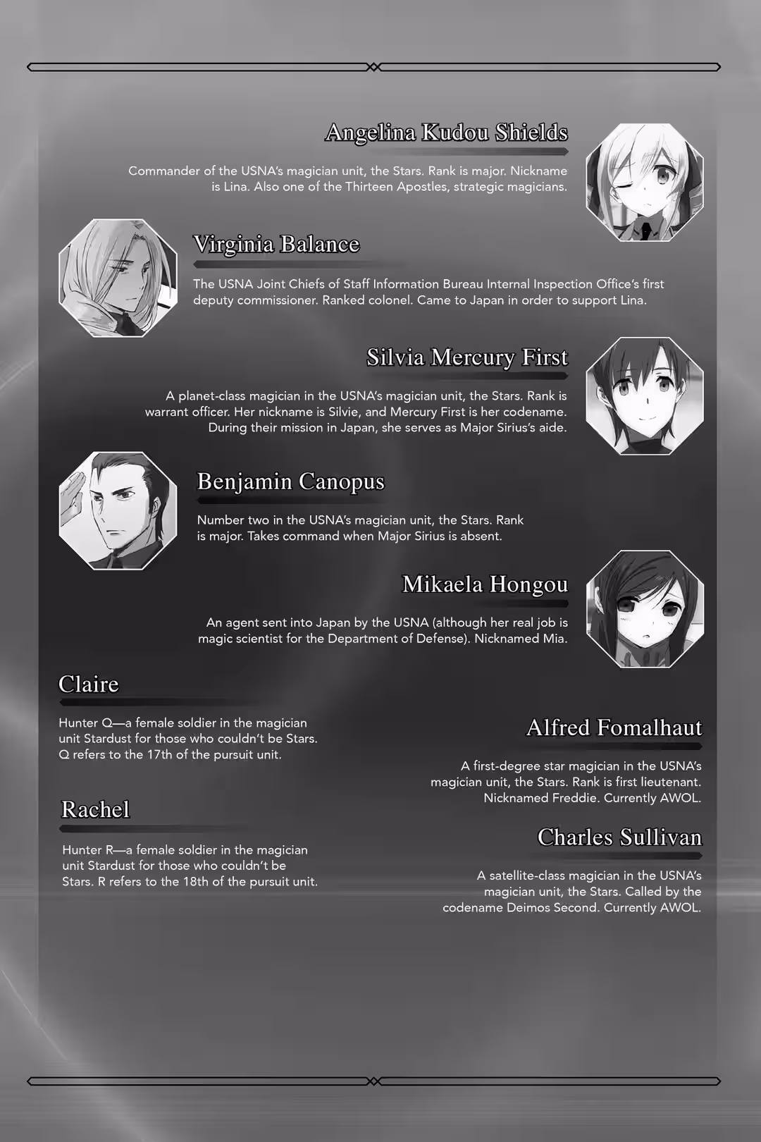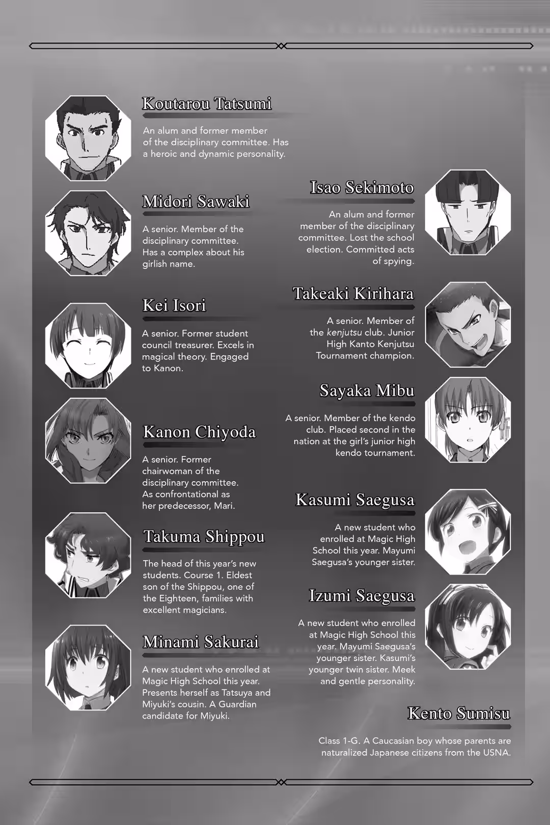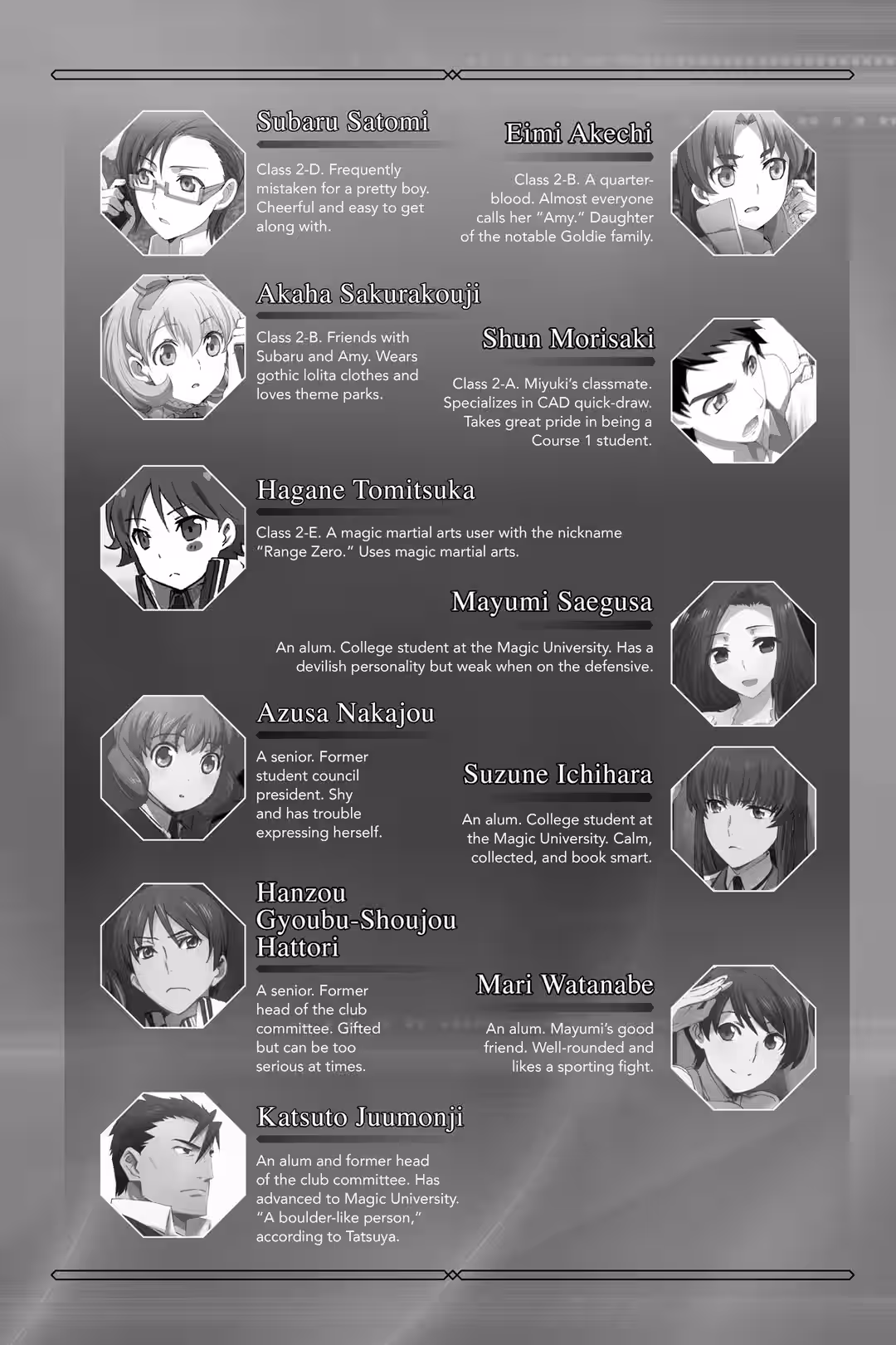 But for those who did know Tatsuya and Miyuki Shiba, their shock was over nothing so vague as to what this news might presage for the future but rather something much more concrete and current: Not only were Tatsuya and Miyuki direct descendants (in a sense) of the Yotsuba line, but because their specific relation to the Yotsuba family had been concealed, it was hardly surprising that the revelation came as a true bolt from the blue to all the boys and girls who had variously felt friendship, rivalry, or something greater than that for either of the two.