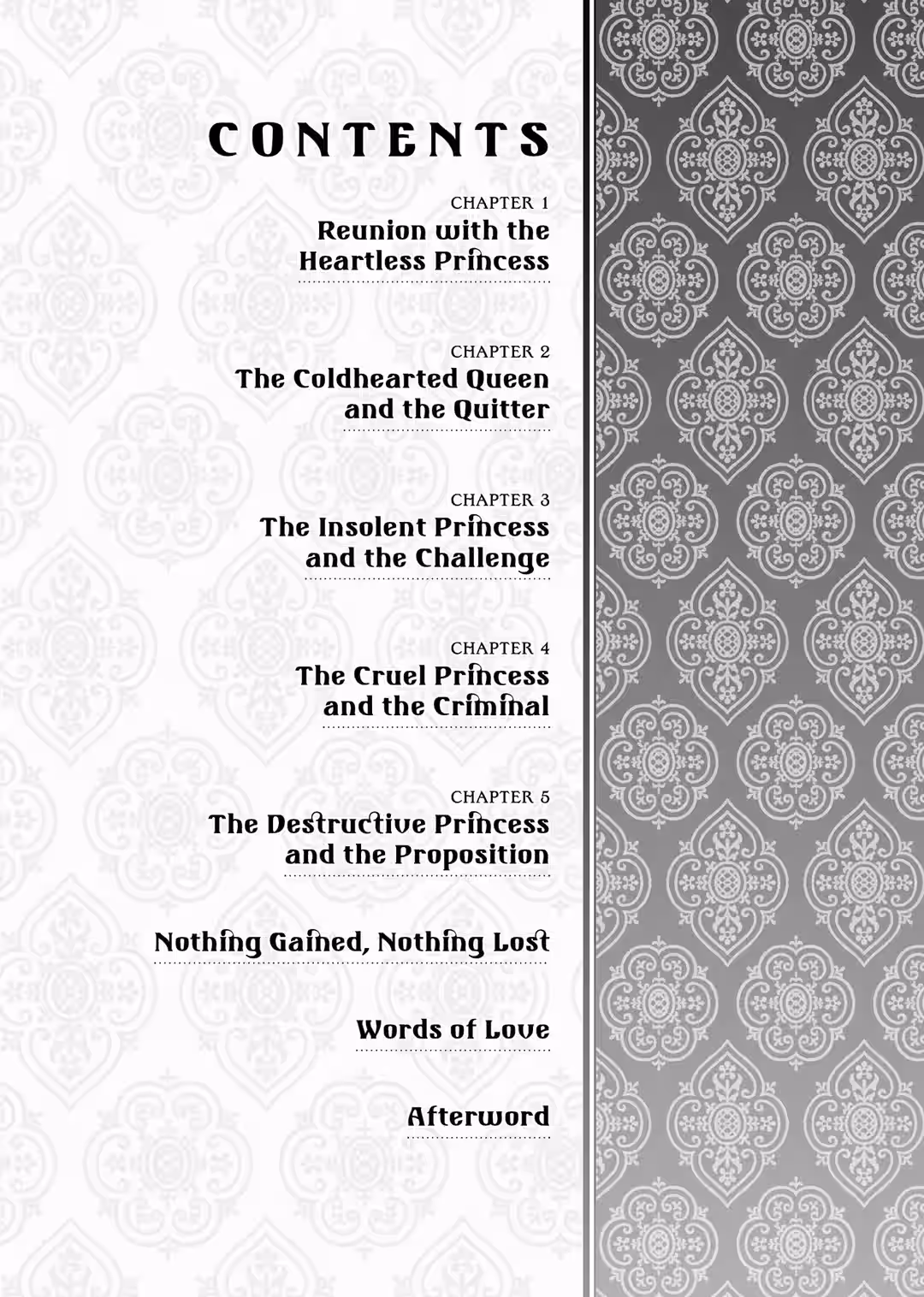 It all began five years ago, on the day I regained my past-life memories and learned of my sins and my fate. I might have been the crown princess here, as well as Tiara and Stale’s older sister, but I’d lived a very different life before this—a dull, ordinary life in which this entire world was nothing but an otome game to me.