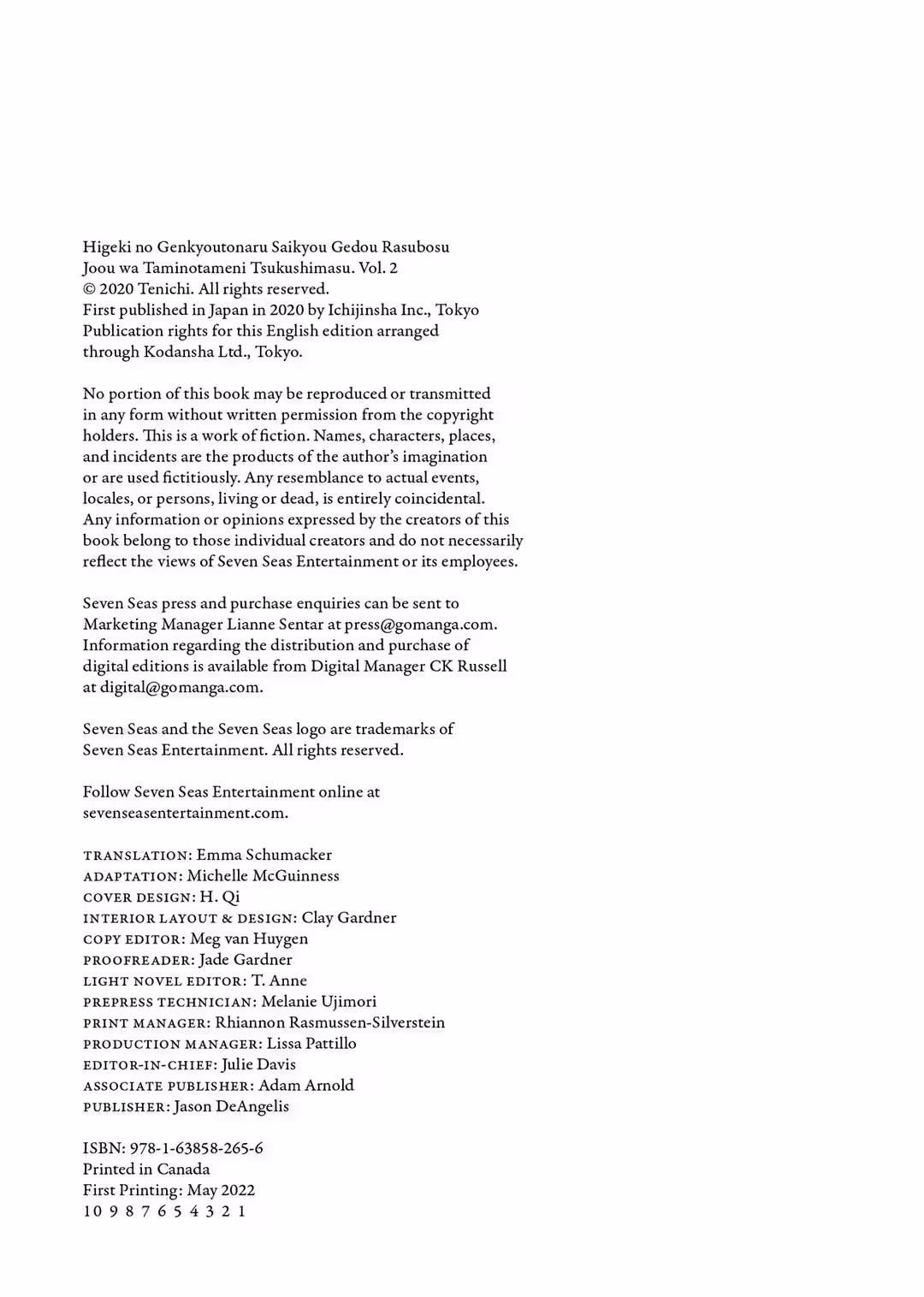 HELLO THERE. My name is Tenichi. I’d like to thank you very much for purchasing The Most Heretical Last Boss Queen: From Villainess to Savior, Volume 2. Thanks to all of your support for the previous book, I was able to write and release this second volume. I truly can’t thank you enough.