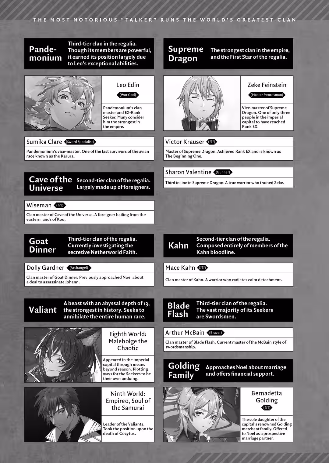 As the number of stars implies, the regalia is limited to seven tiers: Four third-tier clans, two second-tier clans, and the lone first-tier clan sitting at the peak. Until just recently, the seven clans of the regalia were as follows: