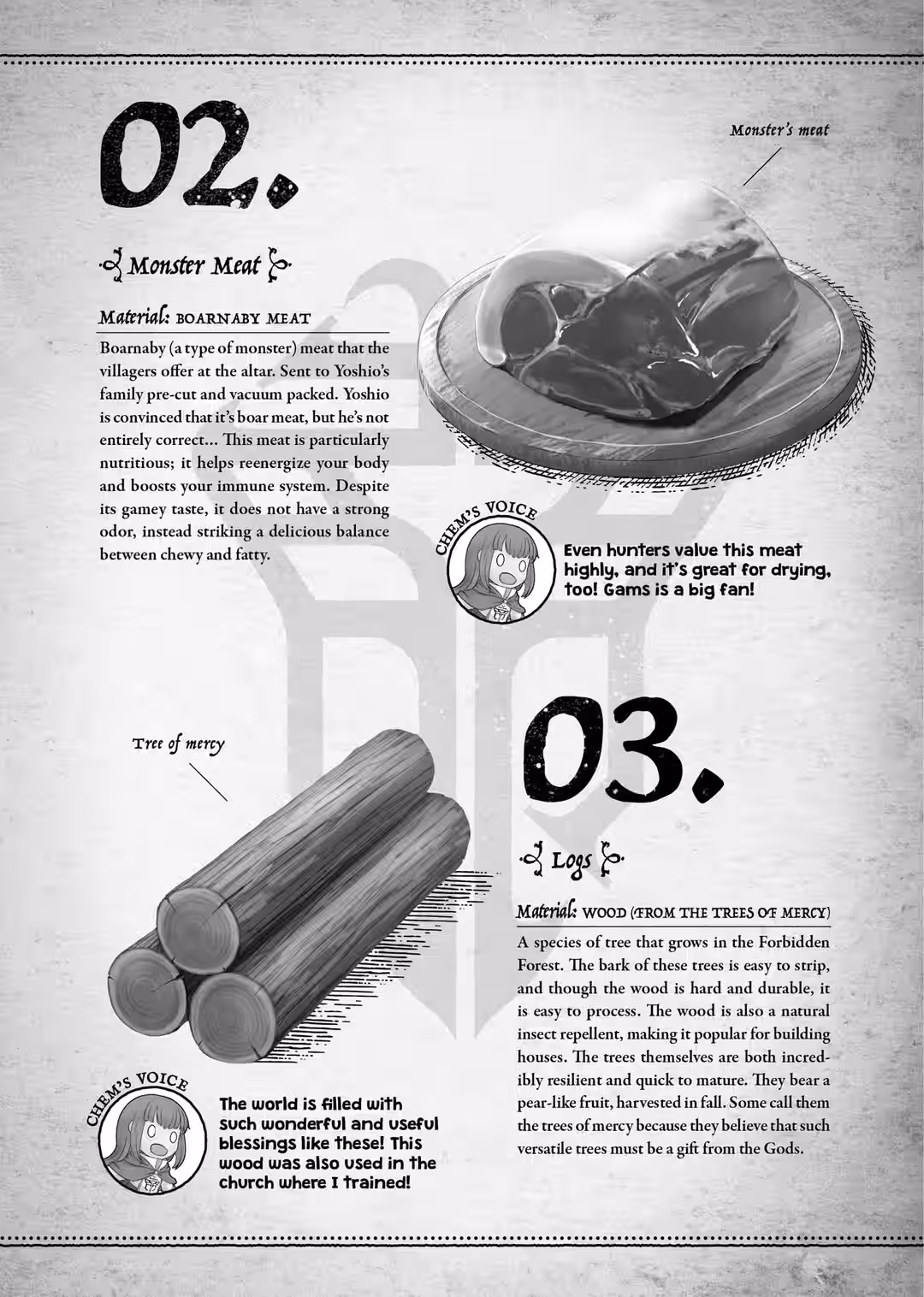 I also like the other characters a lot, of course, and I am very attached to all five core villagers. There’s the strong and dependable Gams, his sister Chem, who is…unusually fond of him, Rodice who looks feeble at first glance but has a level head, and his cheerful and plucky wife Lyra.