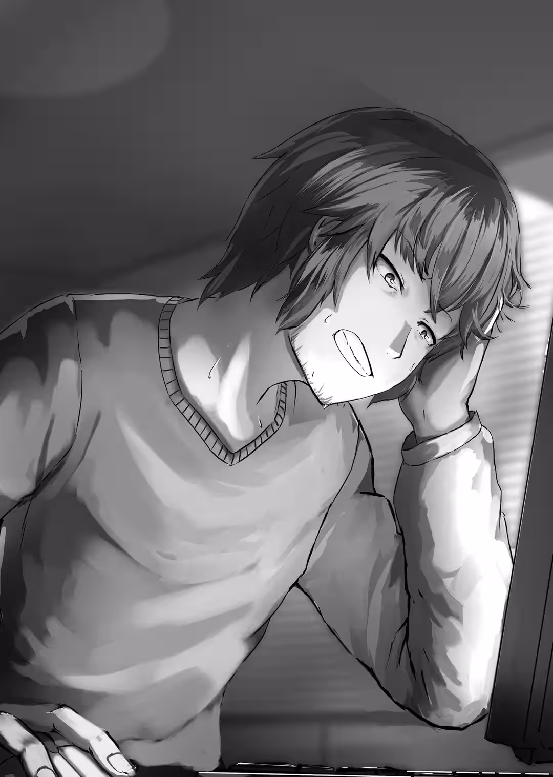 The contents of his room were simple: a desk and the computer atop it, a bookcase filled with manga and light novels. On the floor was his futon, which he never bothered to fold away, and some weights which lay in the corner.