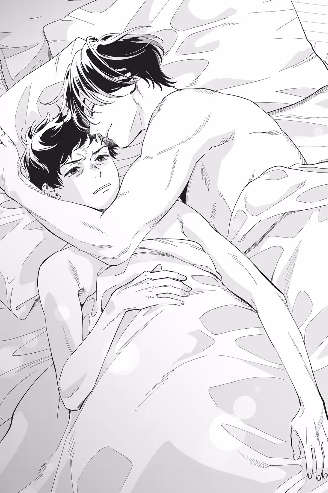 Since Seiichirou’s body was immobile, his gaze wandered around the room, which was illuminated by the light streaming in through the gap in the curtains. He was already familiar with the subdued green walls and the glossy wooden sideboard. Perhaps “familiar” was overstating it, though. Seiichirou had been living in this room for two weeks, but a sense of discomfort still lingered inside him—he was uncomfortable with the soft sheets, the feather duvet, the ridiculously chiseled face right in front of him, and the muscular arms wrapped around his shoulders.