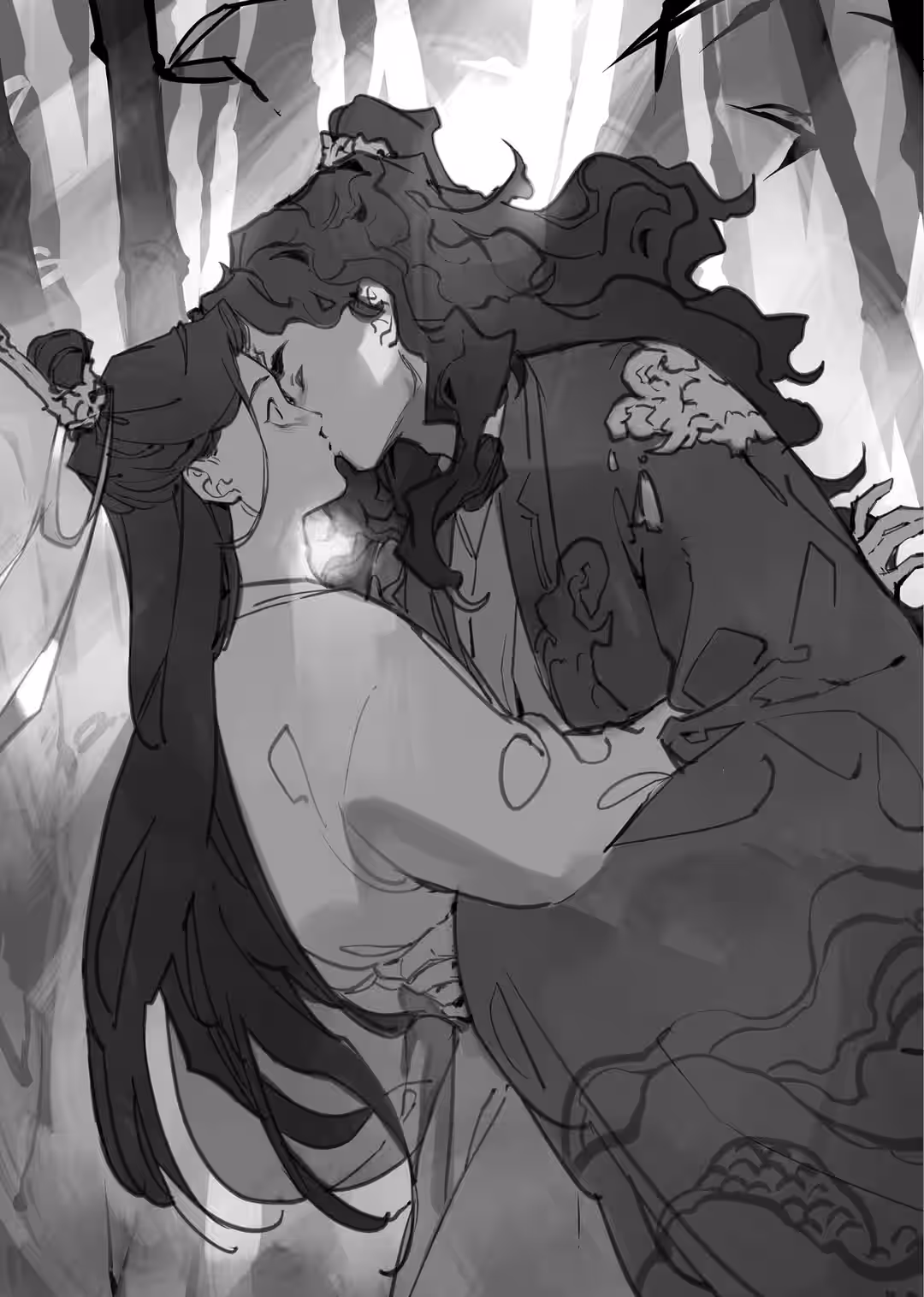 Shen Qingqiu pulled Mu Qingfang over to sit down and glanced at the glittering water by the boat. He could even see several fish happily swishing their tails as they swam by. “This water is so clear,” he said idly.