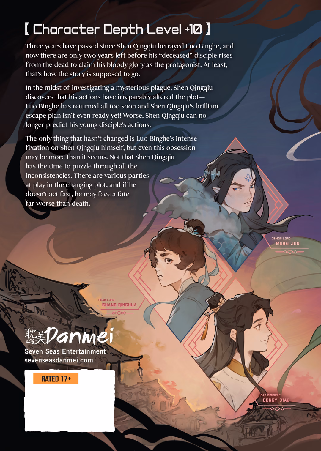 During these three years, other than occasionally asking Liu Qingge for assistance in clearing his meridians to treat his poison, requesting medicinal prescriptions from Mu Qingfang, and briefly visiting Qing Jing Peak to arrange leveling missions for his disciples, Shen Qingqiu spent most of his time wandering about the outside world.