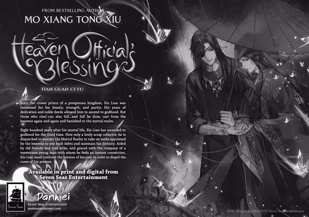 Mo Xiang Tong Xiu (MXTX) is a globally renowned author whose works are often cited as the best-known in the modern danmei genre. Originally self-published via the novel serialization website, JJWXC, her current titles include The Scum Villain’s Self-Saving System, Grandmaster of Demonic Cultivation, and Heaven Official’s Blessing. All three series have received multiple adaptations and have been published in numerous languages around the world.