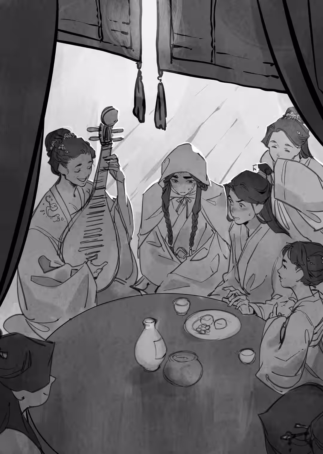 10. 春山很: Chunshan literally translates to “Spring Mountain,” while 恨 can imply resentment, hatred, and/or regret, depending on context. Since the story seems to be about Luo Binghe’s despair over losing Shen Qingqiu as told by the brothel ladies, “regret” seems closest to the intended meaning, though this is narrower than the original Chinese.