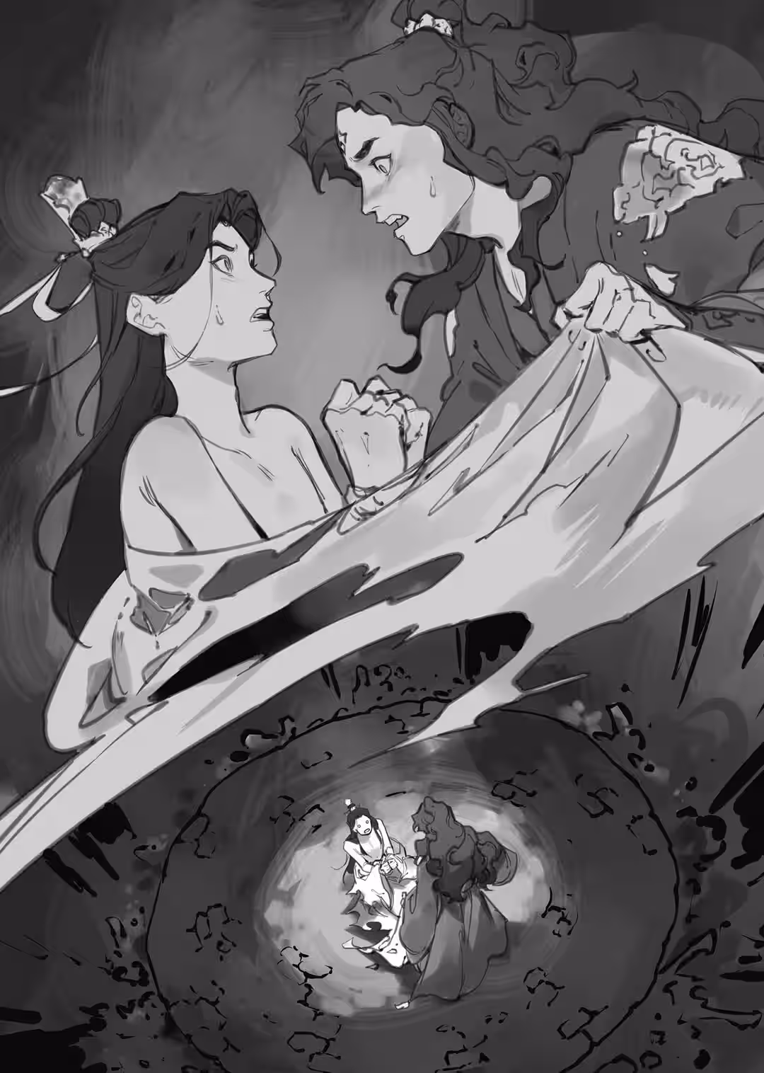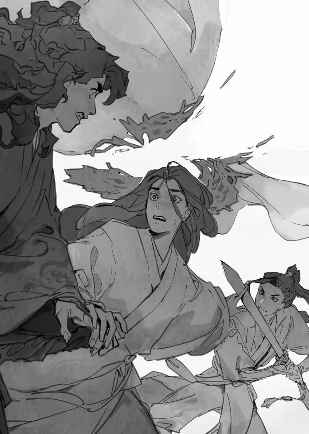 Thus, the trio flew out on their blades. Before half a day had passed, Shen Qingqiu gazed downward from above the clouds, took a deep breath, and yelled to his two sect siblings, “The Luo and Heng River junction is right below us!”