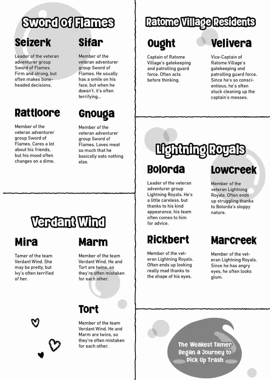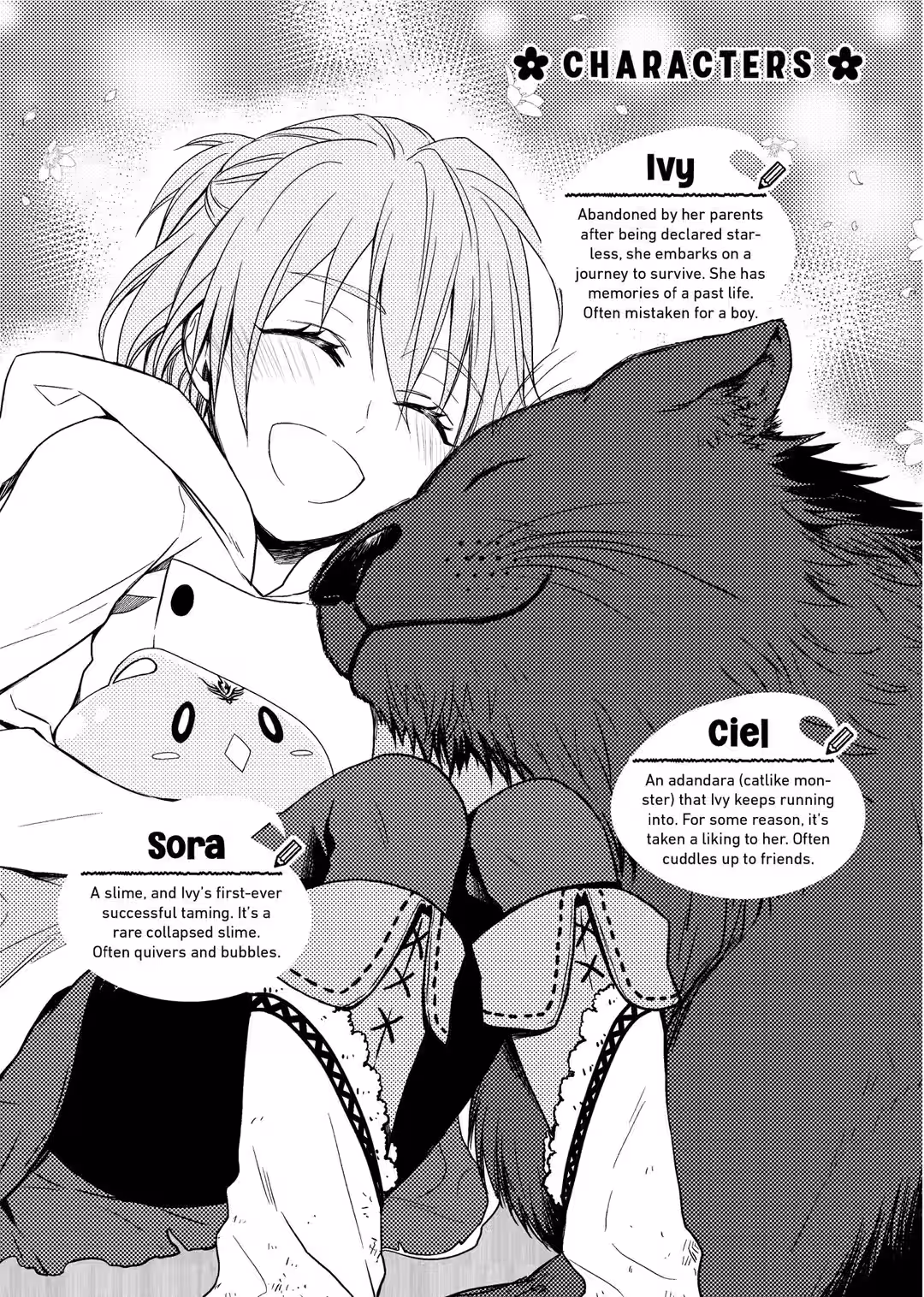 HI, EVERYONE. It’s been a while. I’m Honobonoru500. Thank you very much for picking up The Weakest Tamer Began a Journey to Pick Up Trash Volume 2. Just like the last volume, illustrator Nama has provided us with some beautiful illustrations. I’m also overjoyed that so many people have been reading the recently released manga.
