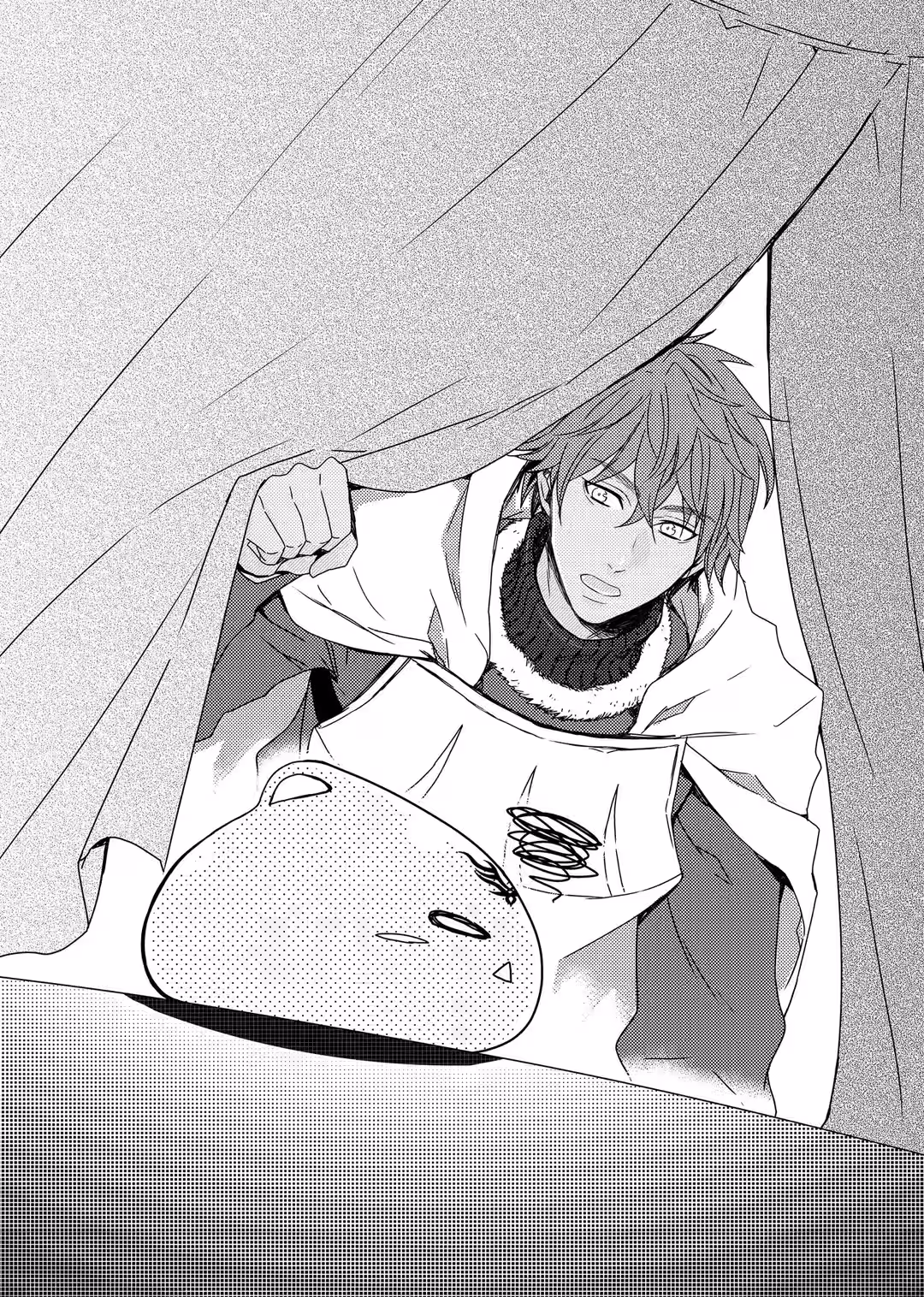 I took Sora out of its bag and hugged it tight. The slime seemed to sense something was wrong. It quietly cried, “Pu, pu!”—something it never did in the tent. I felt for auras outside and heard voices talking in the distance. I could also hear people moving around, but they didn’t seem to be focused on me.