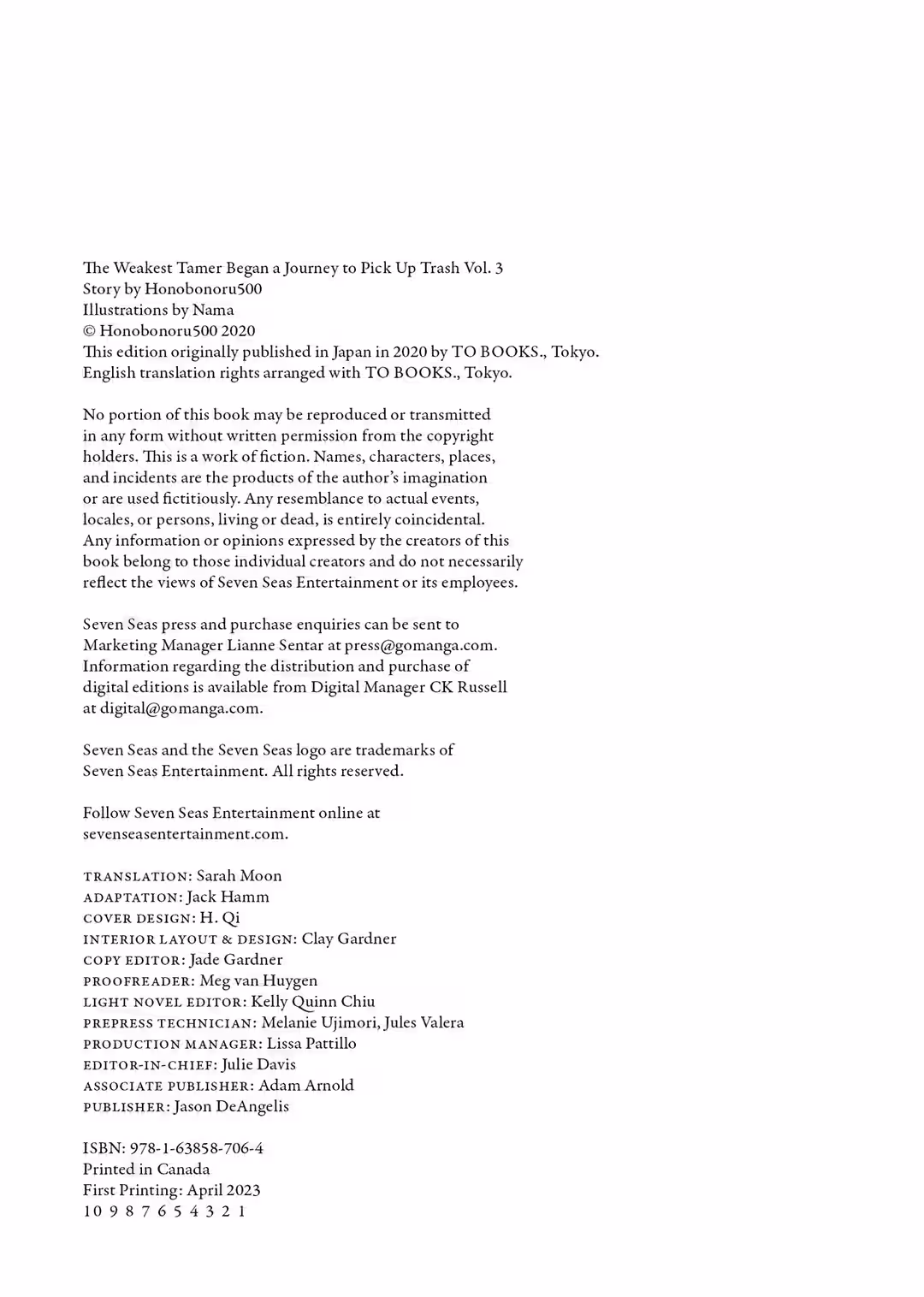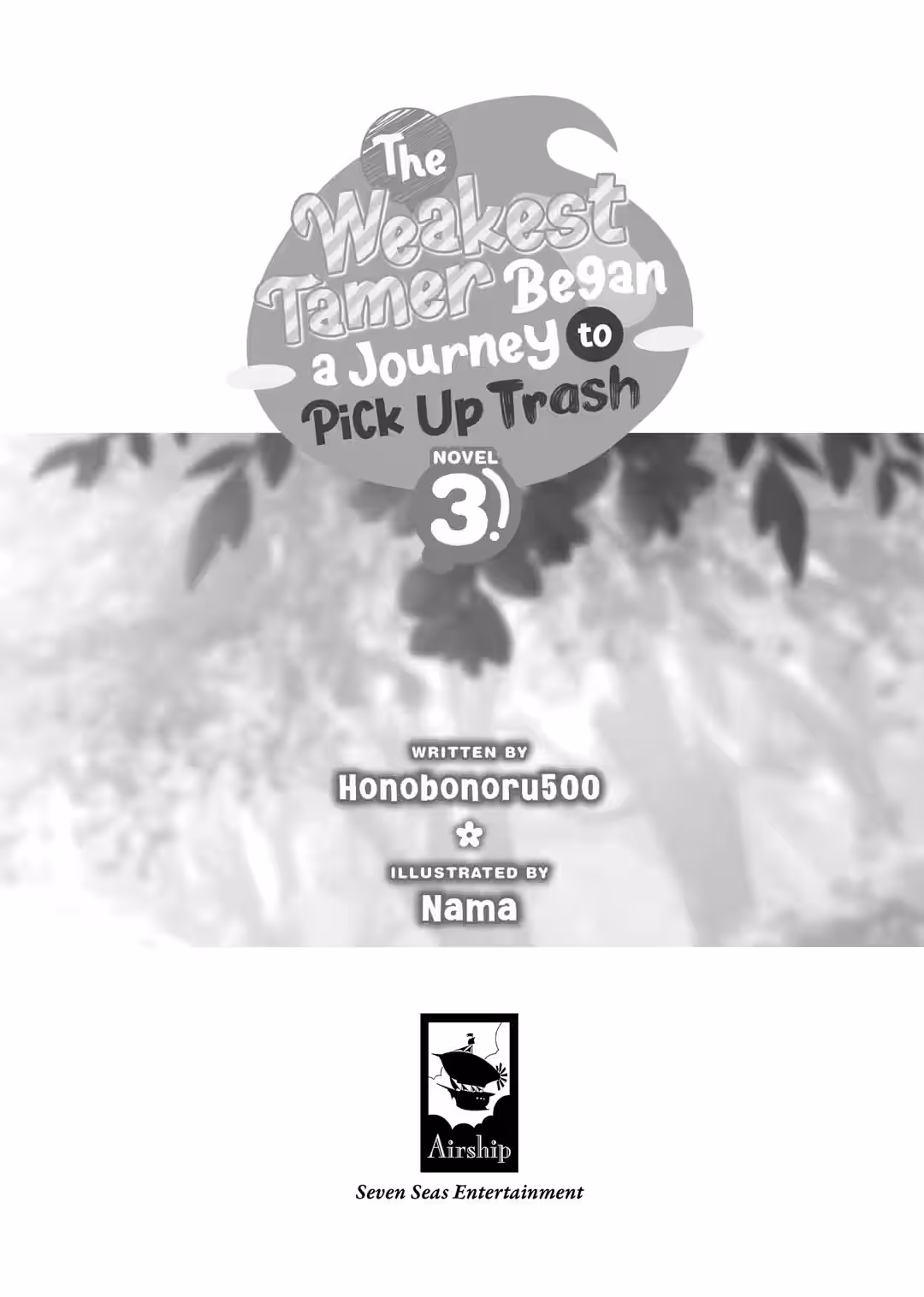 LONG TIME NO SEE, everyone. Honobonoru500 here. Thank you for picking up a copy of The Weakest Tamer Began a Journey to Pick Up Trash, Volume 3. And thank you to my illustrator, Nama, for once again drawing me such beautiful pictures. In July of 2020, Volume 1 of the manga version of this series is going to come out. This would not have been possible without the support of so many. Seriously, thank you all.