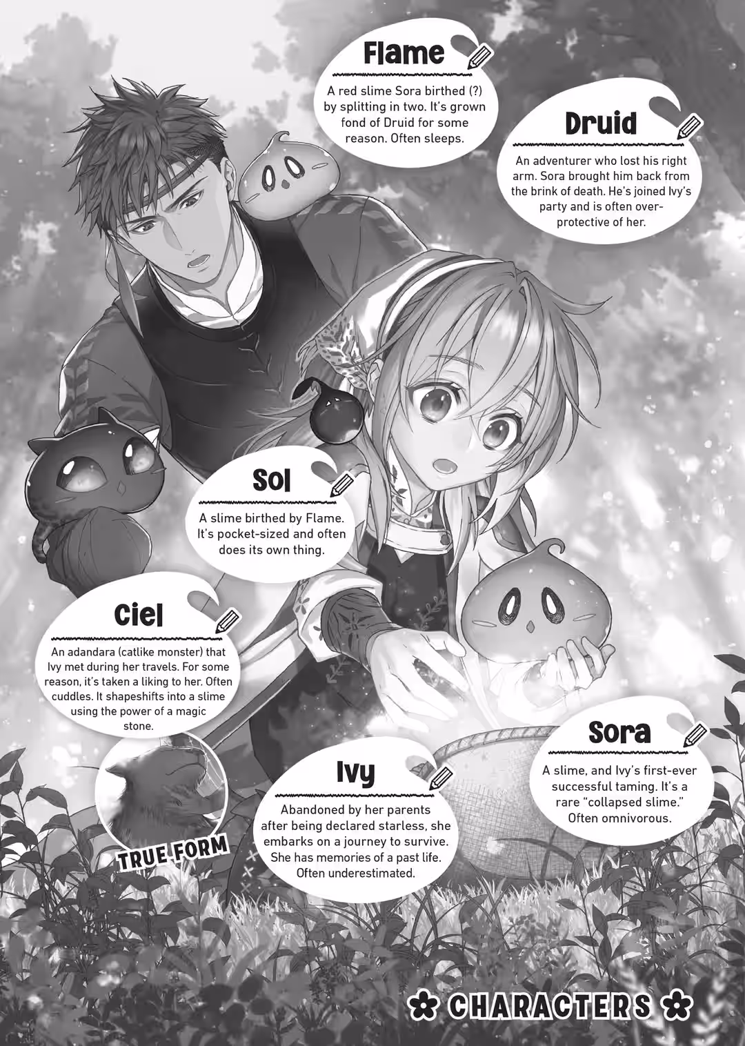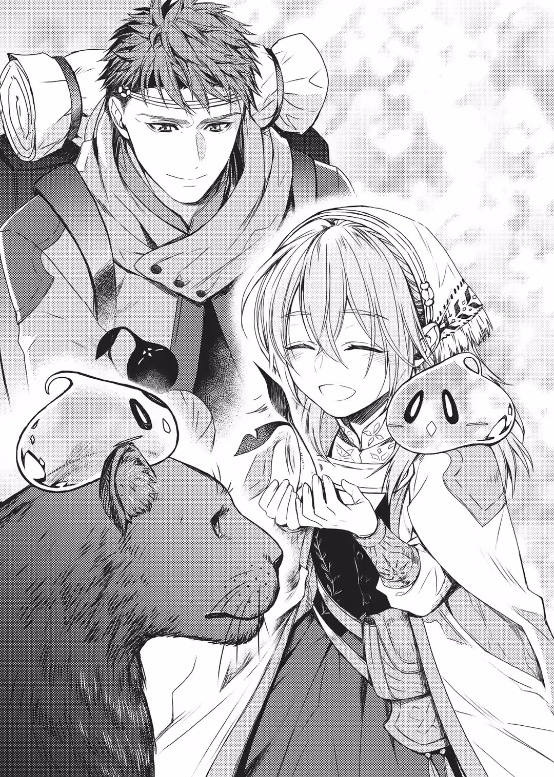 Also, this arc has some new characters who will later become important—the tree monsters. I had tree monsters attack Ivy at the beginning of the story, but I wanted to make it clear that there were also friendly tree monsters. Nama-sensei, my illustrator, thank you so much for the adorable drawings of baby Toron. When I first saw your sketches of Toron, all sorts of visions came to me. One of them was the thought that Toron would be so cute tangled in some vines—which wound up becoming an original short story for this book. I hope I conveyed my adoration and wonder for Toron to all you dear readers, too.