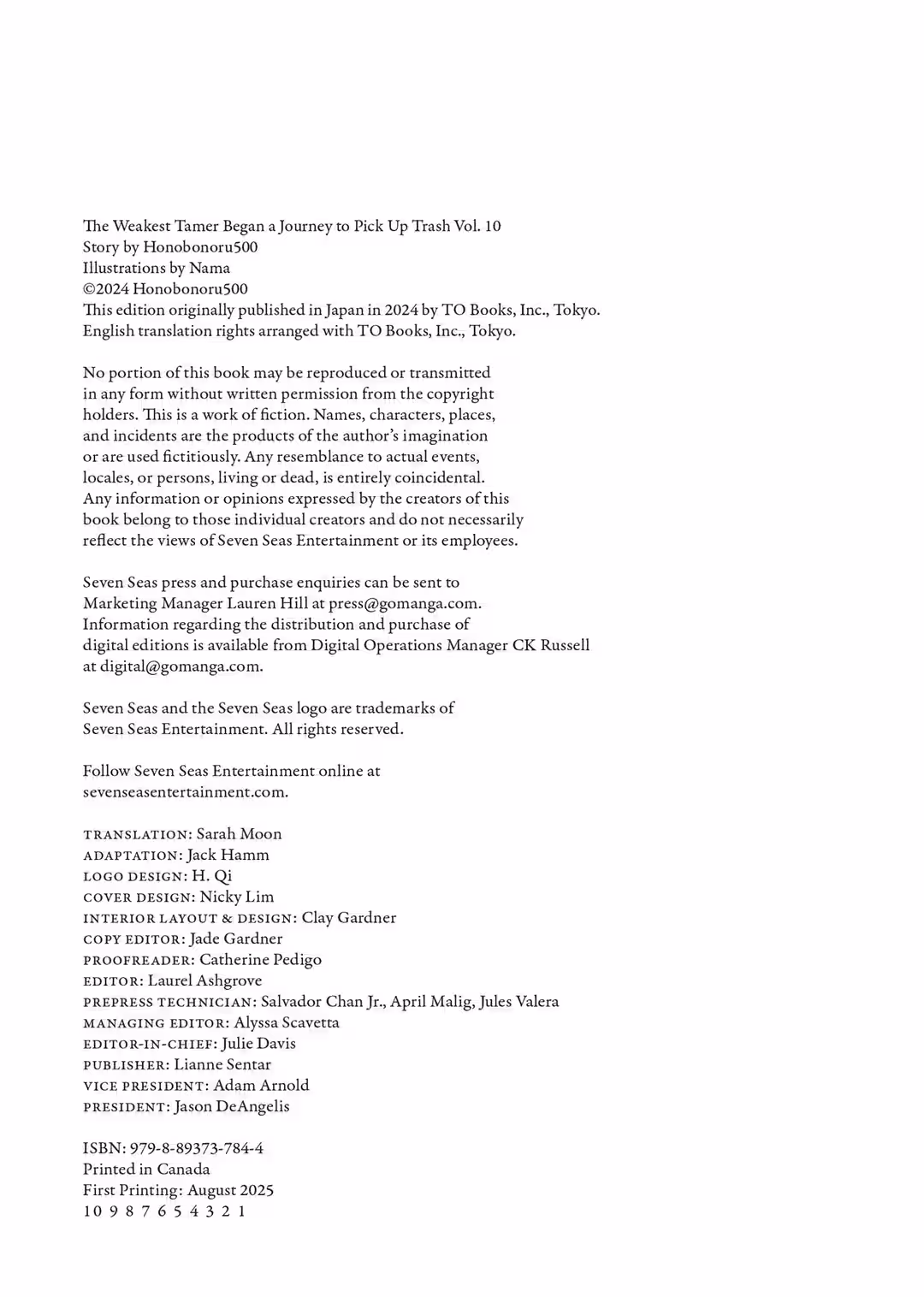 Lastly, I would like to thank everyone who read this book with all my heart. I hope you’ll give Volume 11 a read, too. The manga version of The Weakest Tamer Began a Journey to Pick Up Trash is also selling well. May we meet again in this “Isekai’ed into a world…where proper waste disposal rules!” light novel and manga series.