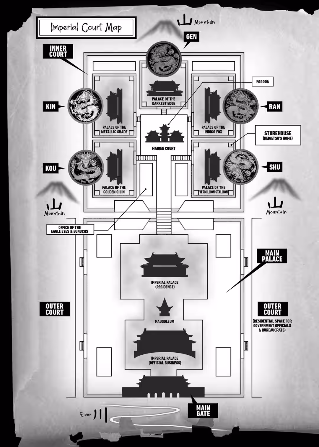 The five aristocrats sent from each clan were to be divided up into one empress and four consorts. They spent their days in their respective palaces, which were arranged in a pentagon around the inner court, taking care to uphold the established order all the while.