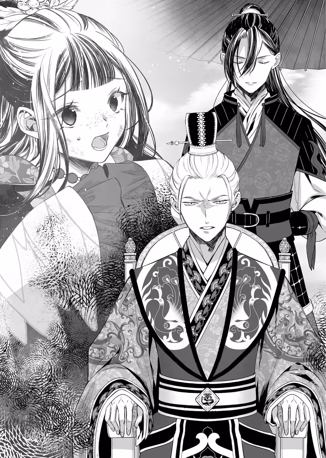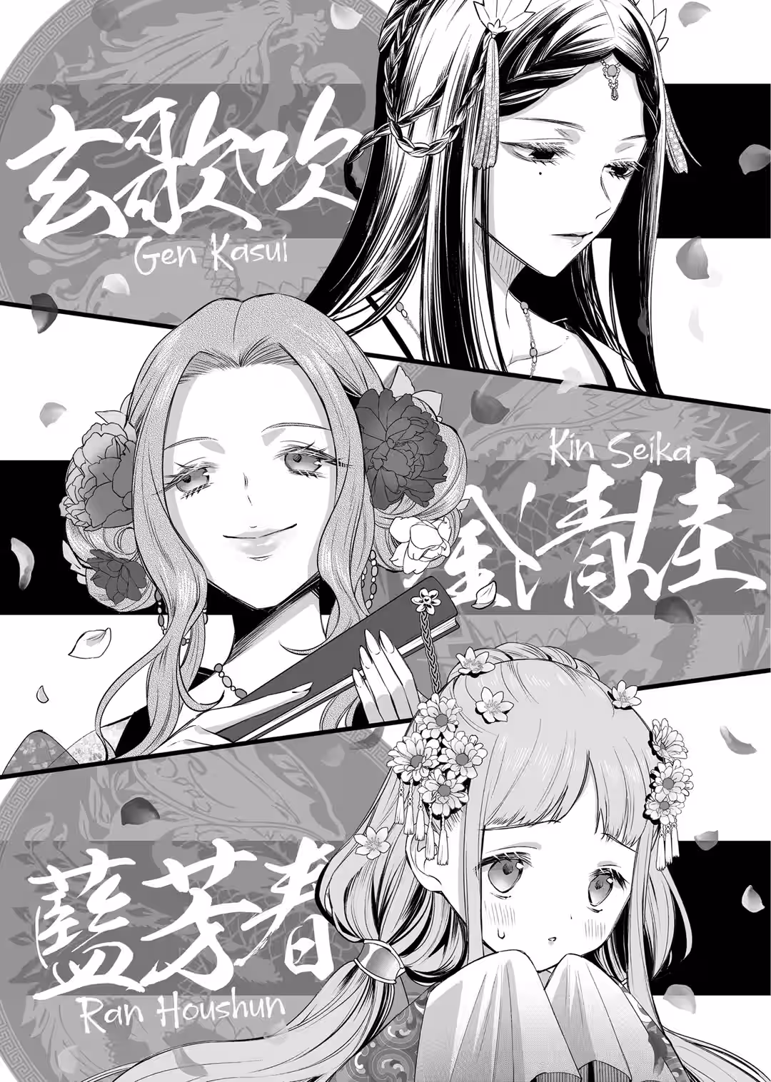 The current emperor, Genyou, was past the age of forty. The Maiden Court had been opened to a new generation, and Reirin and the other four girls had been assembled to fill its ranks. Until the crown prince, Gyoumei, ascended the throne, these girls were to spend every daylight hour in the Maiden Court, competing to determine who possessed the highest value as a woman.