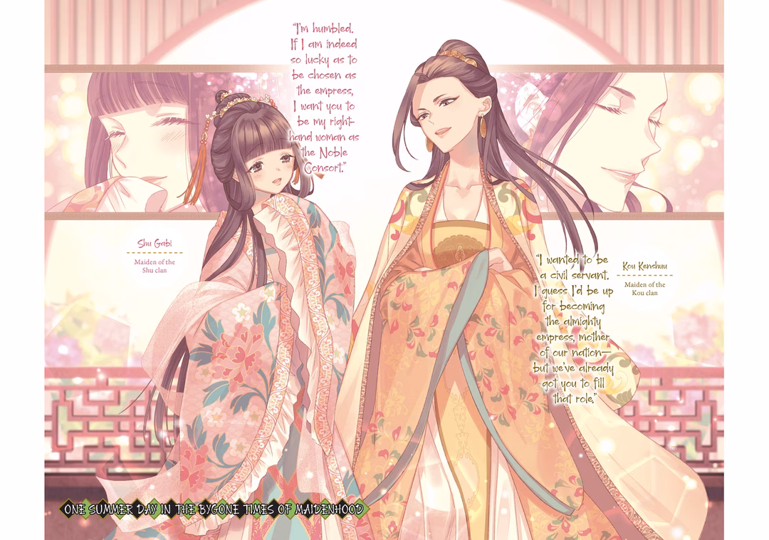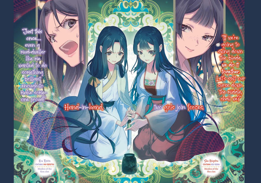 Sometimes Keigetsu would go to her crying that she didn’t know how to do something and ask for her guidance, only to have the woman huff a delicate sigh and say, “You’d do better to use that magic of yours to trade places with Kou Reirin.” The consort would then turn around and innocently praise the Kou Maiden in her next breath, which forced Keigetsu to realize the truth whether she liked it or not: Consort Shu had really wanted a Maiden like Kou Reirin all along.