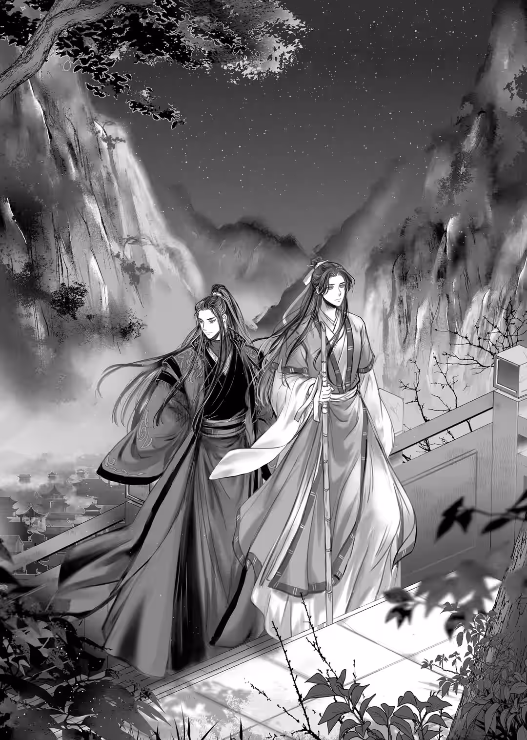 The man in front sauntered in small steps, his demeanor as languid as if he truly trod on level ground. The steps of the young man behind him stretched a little longer. Taken alone, the young man in back also bore an immortal’s weightless grace, but seen together it was easy to find the subtle differences between the two.