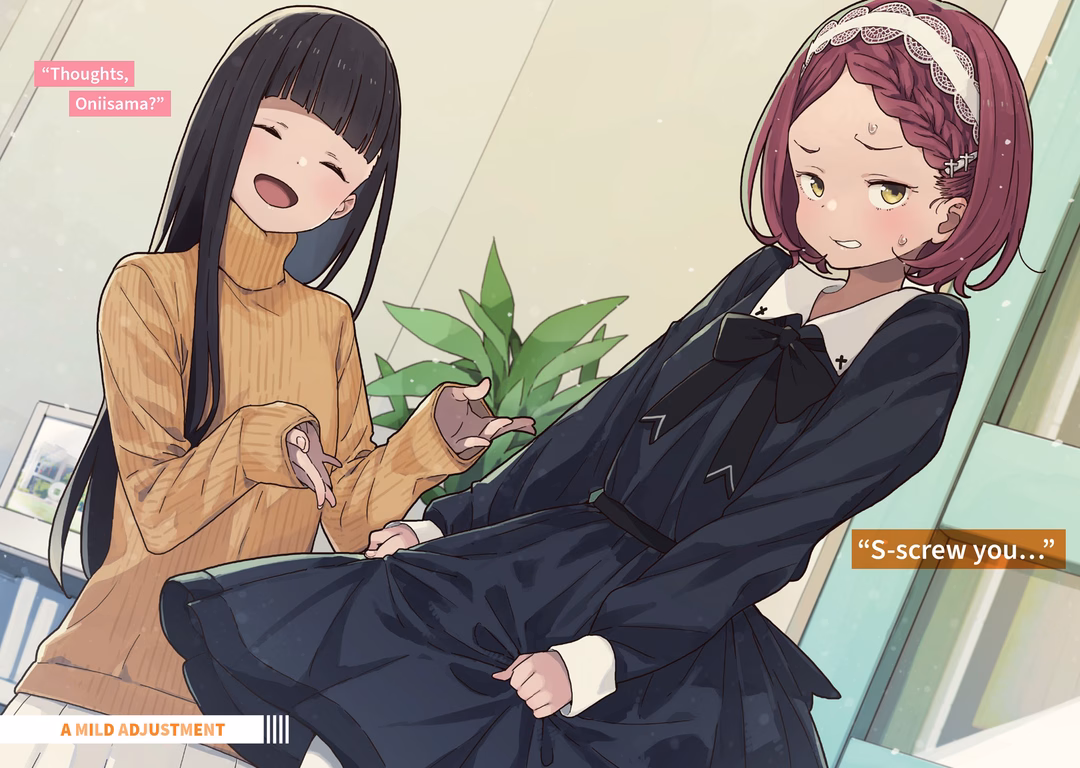 “Oh dear, would you look at that,” she interrupted, poking her own cheek. “I’ve gotten some oh-so-sweet and delicious chocolate on my face. Would my dearest Oniisama care to help make it all clean?”