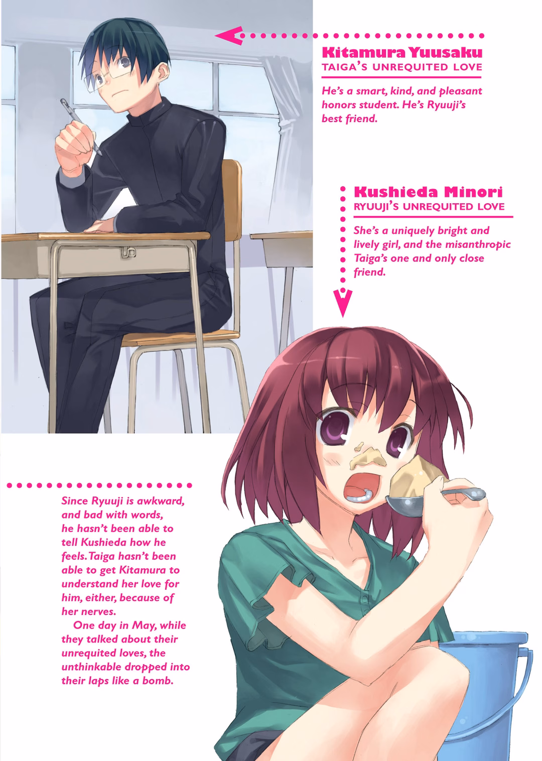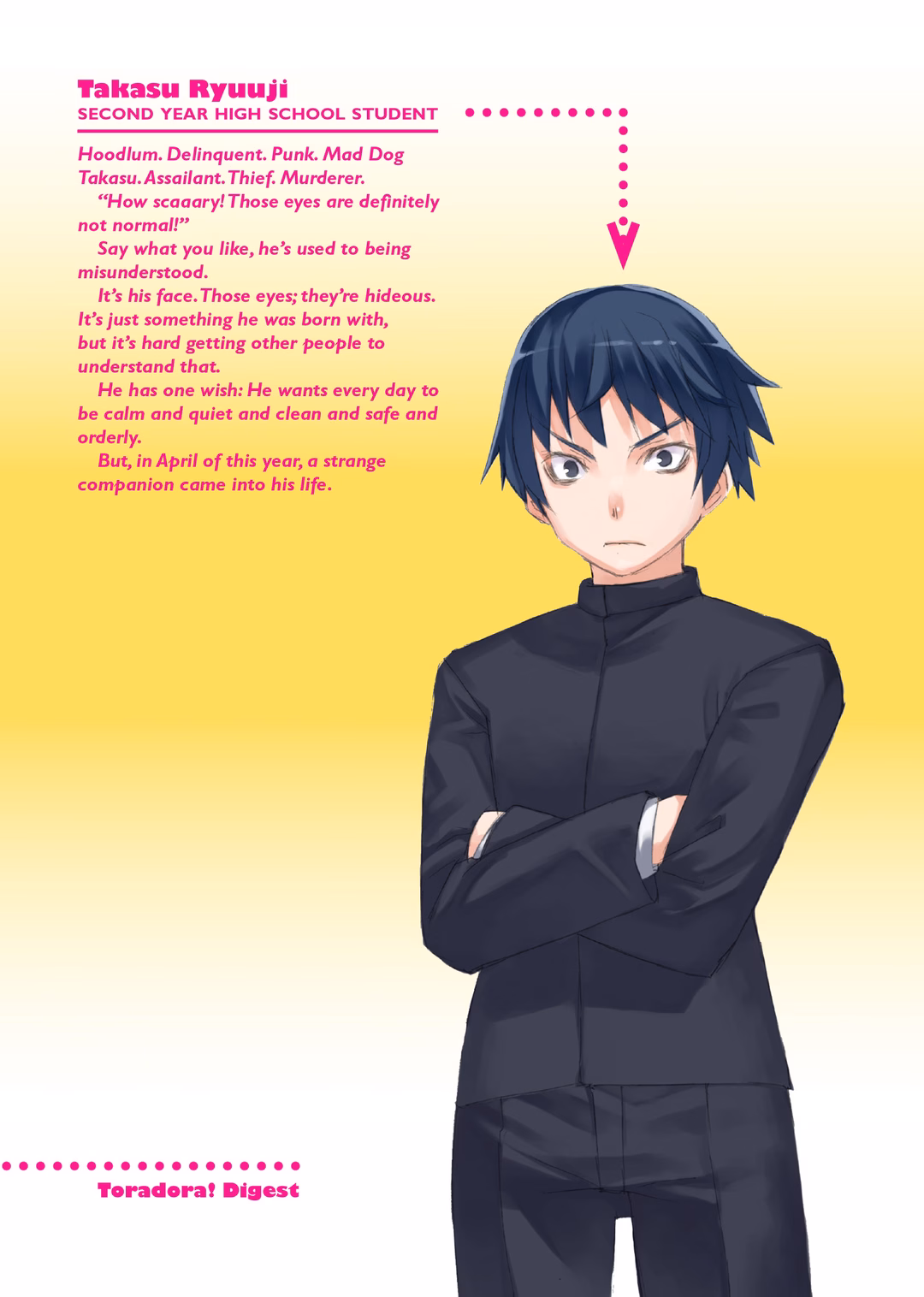 Takasu Ryuuji sat as far away as possible from her on the left side of the sofa, staring at his own toes with his brutally sharp, angled eyes. Saying anything would be futile. He didn’t have the strength to fight with her. Besides, this wasn’t the time for that.