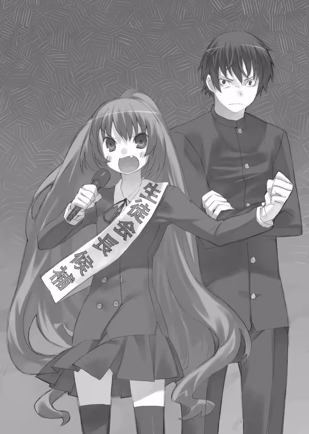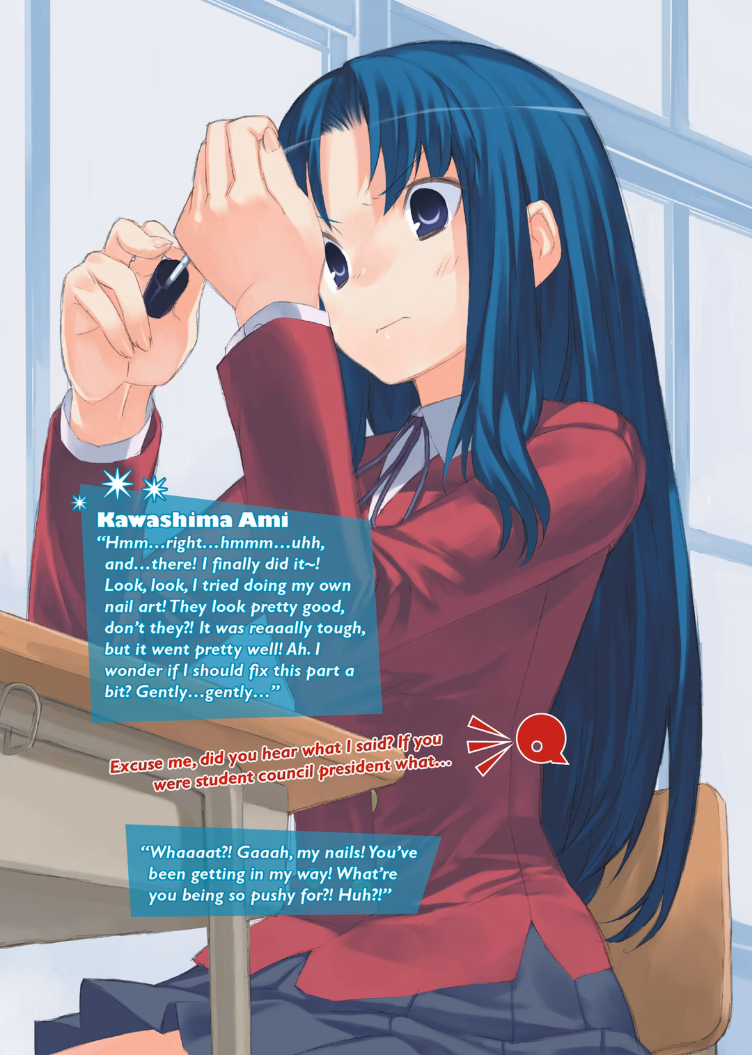 Fwoosh. As she magnificently insulted him, she pulled out the thing she had stuck up his nose. It was lip balm; about three centimeters of the bare stick extended from the end. Her face contorted. It went without saying that the one who’d just given Ryuuji this forceful wake-up call was the beautiful thug Aisaka Taiga—better known as the Palmtop Tiger.