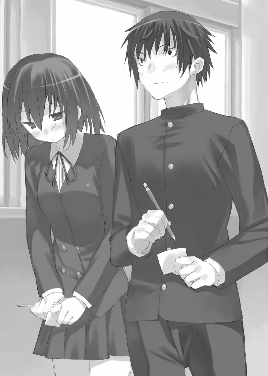 Kawashima Ami, the perpetrator, apologetically turned towards the victim with her teary Chihuahua eyes. But those tears, and even her interest, coldly dried up in an instant, like a desert at night. She was a childhood friend of Kitamura Yuusaku, whom she had hit. Attempting to sway him with her good-girl act was just a waste of hospitality. Hmph. She sighed in irritation.